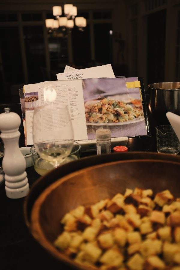 Seriously, start by cutting up the four loaves of white bread into small squares excluding the crust the night or two before. Get up early, like the crack of dawn and bake off the pies. Peel all those potatoes and cook and mash and keep warm over a Bain de Marie after you’ve sautéed the celery and the butter and the onions for the stuffing. Oh, and the sweet potatoes should be baked on Wednesday and sit overnight. Green beans need an ice bath. Cranberry sauce you need fresh and cooked, do that all ahead of time, like Tuesday. Ask your kids to make the place cards and set the table and pray. Have store bought frozen gravy secretly stored in the freezer and fake packs of dried gravy mix secretly stored in the pantry, the kind you just mix with water in case the gravy goes bust, you can fake it with a little bit of the pan drippings and butter and wine and maybe some whole milk.