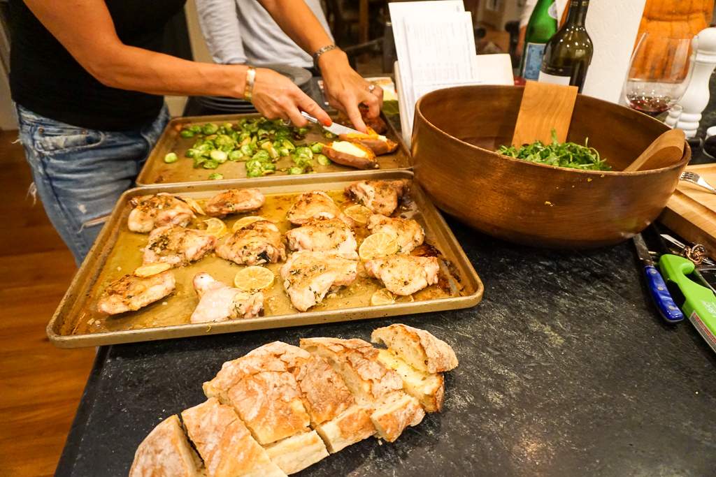 No recipes, hot oven. Chicken thighs with butter, thyme, lemon juice. Roasted Brussels Sprouts with sea salt and olive oil. Baked sweet potatoes slathered with more good butter. Arugula tossed with lemon juice, olive oil, and shaved parmesan. I have these sheet pans in multiple sizes and use them all the time. Here you see the quarter-size version, perfect for a party of four.