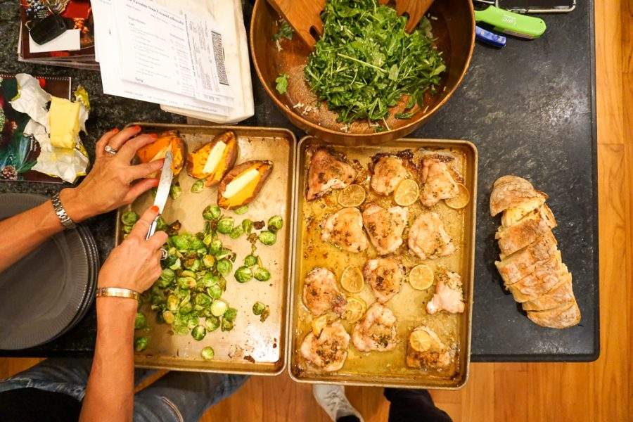 Nothing fancy here, and nothing makes me happier than dinner with my family. With good ingredients and a few sheet pans I can put out a weeknight meal that soothes the soul. This was one of those impromptu weeknights when both sons stopped over post-squash for a sit-down with us, the newly empty nesters. It was simple, and divine. Showing you the real life, messy kitchen counters and all.