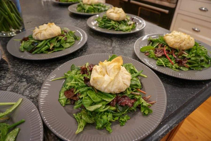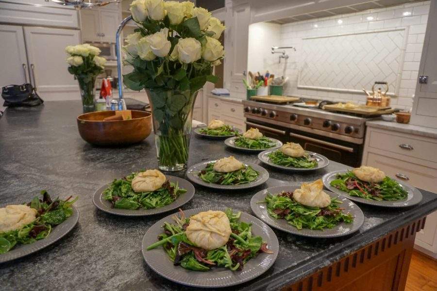 greens are dressed, plated, readywith the warm French cheese in pastry it was delicious, maybe a little heavy on the dressing, I panicked at the last minute, andI probably could have kept the plate rim a little cleaner it was a working lunch meeting, I set the table and herbal iced tea waiting for everyone I used three small juice glasses filled with parsley and rosemary from the country house down the middle of the table for the centerpiecesthe English chocolate crispswith dried cranberries were delicious I sent small packages of two home with each guest, no one really likes to eat desert at a lunchthe thing that I was most proud of was that my kitchen counterwas clean and not like a hurricane happening