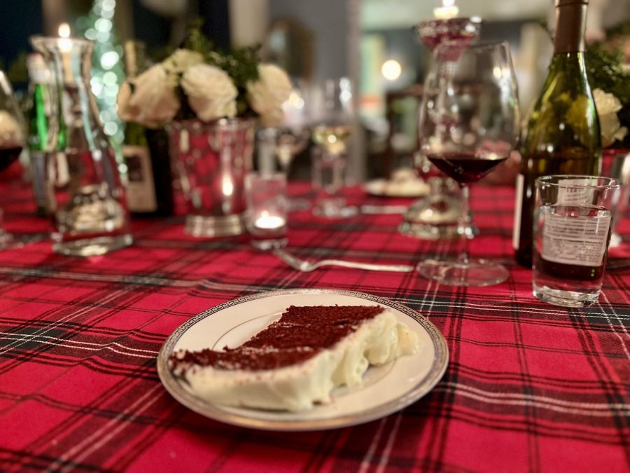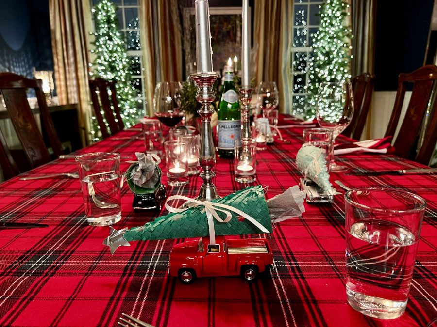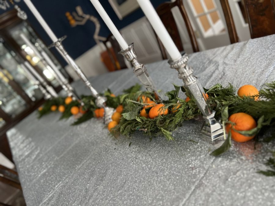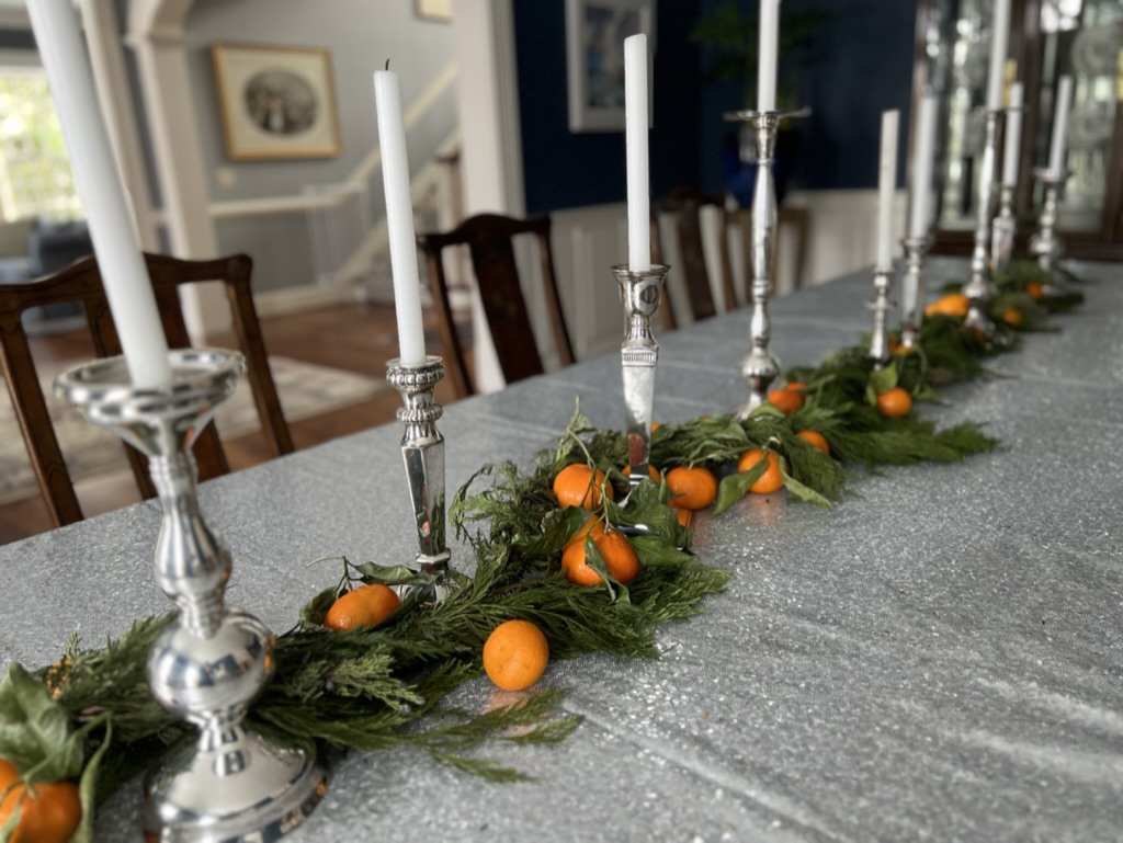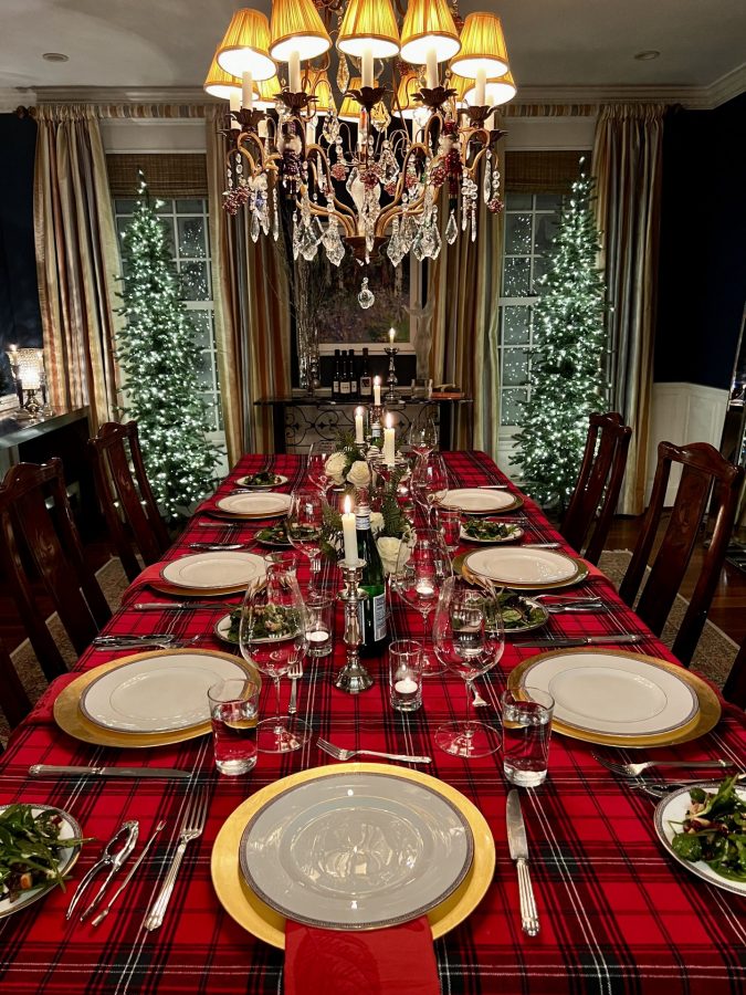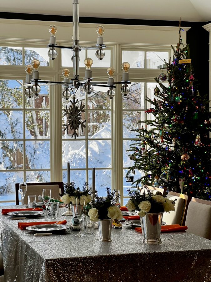 Sunday evening, I served a delicious Boeuf Bourguignon for fourteen, intertwining an evergreen garland down the length of the table and peppering it with clementines. The silver candlesticks were hauled up from my office and given a quick shine before filling them with used tapers. The silver sequin tablecloth was purchased on Amazon for $50 and added instant bling, and beef stew with red wine sauce spills can do no harm. A quick turn in the laundry machine on cold, hang to dry, and good to go for the next fete. The dry cleaning turnaround time for the formal white linen slows me down.