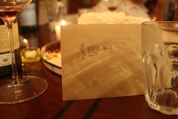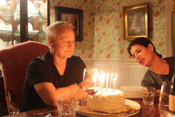 black tee on him, gray tee on me, and scratch carrot cake for all