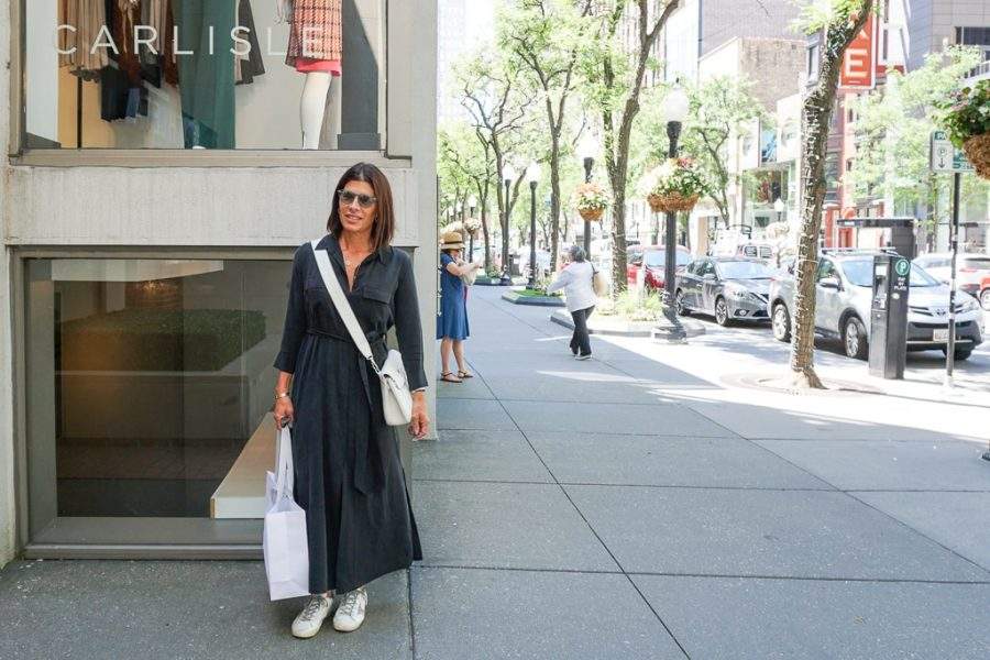 Predictably one of my favorite color palettes is black, white, and shades of blue, (hello Caroline). For touring around the beautiful city of Chicago wore a black silk maxi dress, white sneakers, and carried a white bag, it felt right for a summer city look. That long dress endured 17k steps, up and down and all around the miracle mile, river walk, and even held up for the late afternoon flight home. I’m not afraid in the least of outfit repeat, wore that same dress the night before with a pair of sandals for dinner down in Lincoln Park at North Pond.