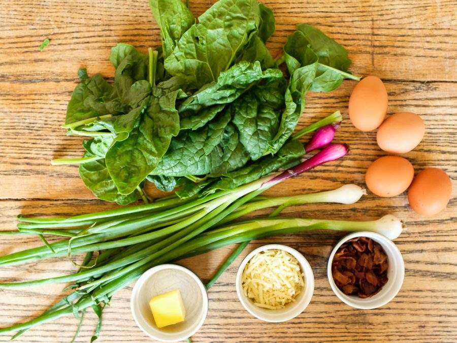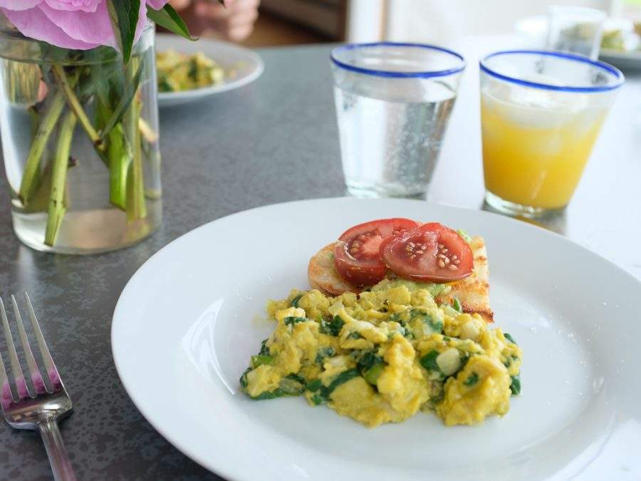 On most mornings my two collegiate daughters and I try and get in as many greens as we can by way of scrambling them into our eggs. We start with sliced scallions and sauté them in butter until softened. Next comes shredded or chopped spinach, swiss chard, or whatever leafy thing we have on hand. Here you see some leftover crumbled bacon and grated gruyere. It all makes for a great wake-up and is scrambled up and dished out usually after a morning workout. Toast with mashed avocado and sliced tomatoes rounds things out nicely.