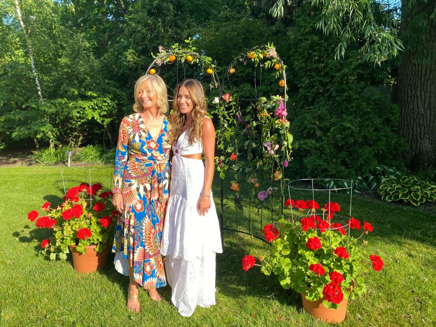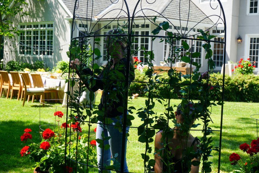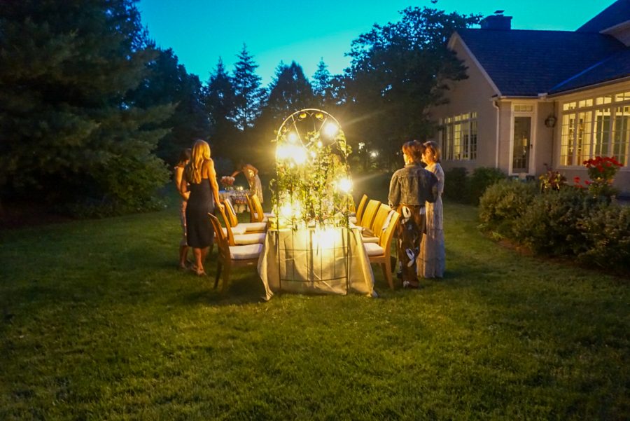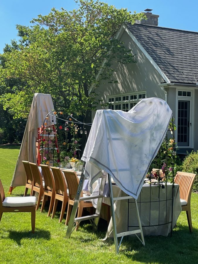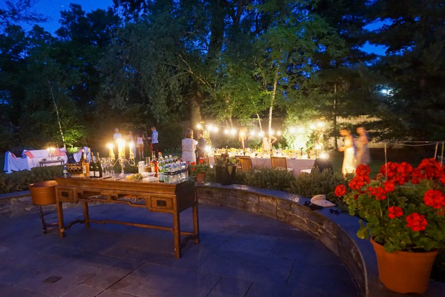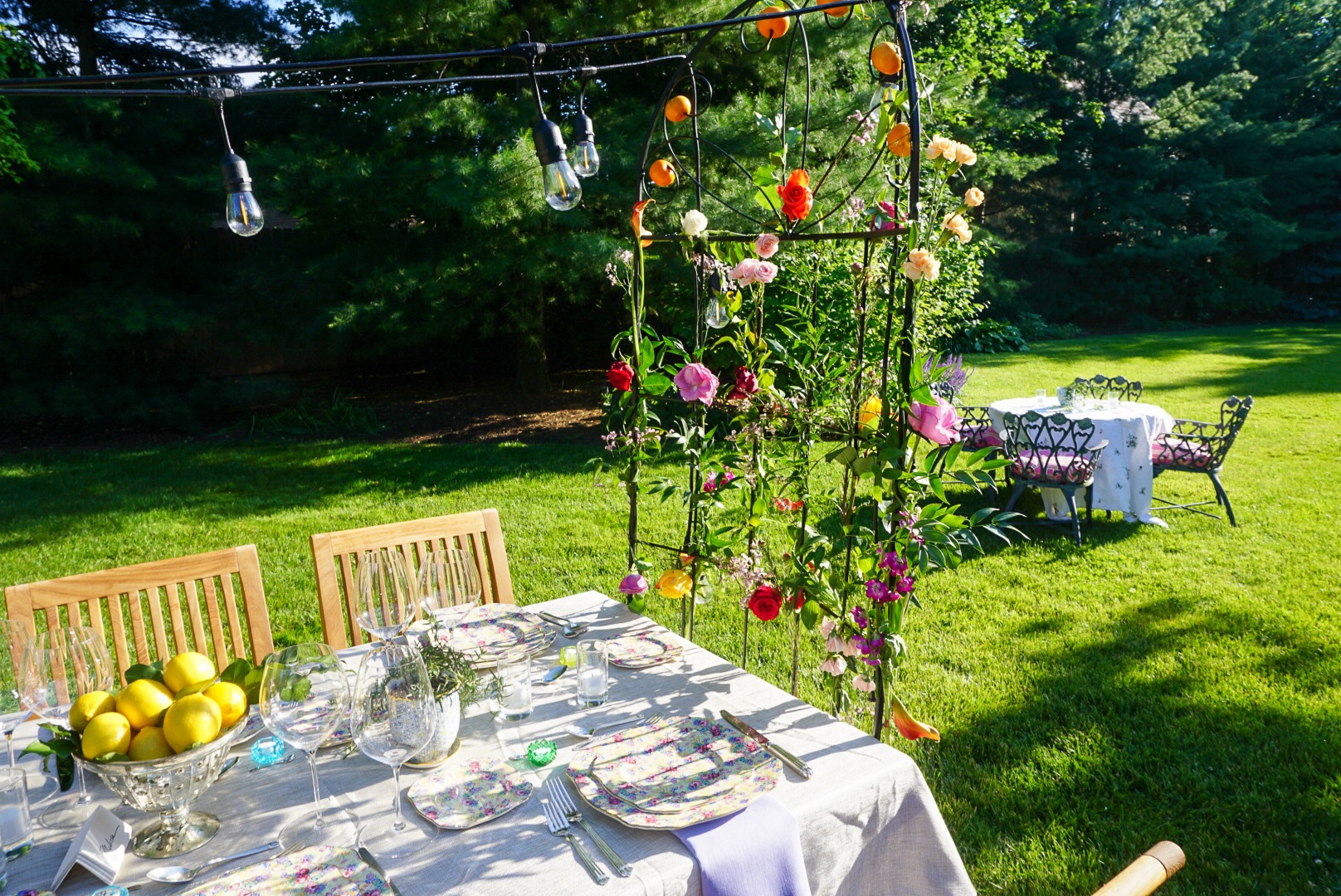 Alexis bought buckets of fresh flowers from Trader Joes, and she organized and implemented the fresh floral step and repeat and the fresh floral end cap trellises, in effect making a little enclosed intimate dining area. We did this all the morning and afternoon of the party, even polishing the silver. It was all hands-on deck, even little Peyton got in on the action. To protect the flowers from the hot sun, I brought step ladders out from the garage and hung sheets to shield them a bit until party time. I also bought four large pots of vivid red geraniums, two for the patio to decorate cocktail hour, and two flanked the step and repeat to add another pop of color. I’m not a lover of red in my city garden, much prefer a softer palette, so those pots got moved out to the country house a little after this party.