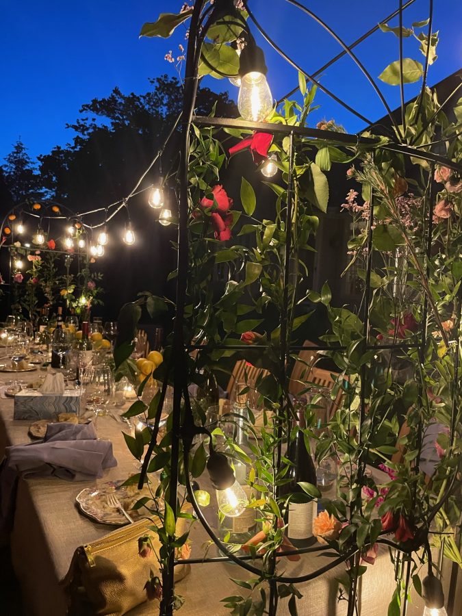 I knew I wanted a to extend the dining table area upward to the sky and stars, so while out on one of my daily walks I thought ‘why not buy the tallest garden trellises I can get, decorate those with fresh greens, and string bistro lights over the table?’, so that’s what I did. Caroline filled her online cart at Home Depot and off Big Red went (our red pickup truck) to fetch our supplies.