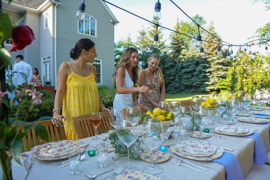 There were only twelve of us, and it was divine. Caroline, along with Alexis, Marilynn, Taylor and myself, set the scene by moving our square table (composed of two rectangles) out onto the lawn and placed them end to end, creating one long table, with six cushioned chairs on each side. I express shipped the cushions in from California after trying to locally source them with no success, thinking women in dresses at a bridal shower should probably have a cushioned chair to sit on.
