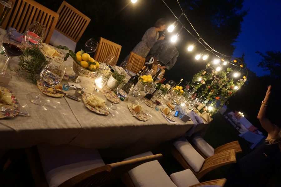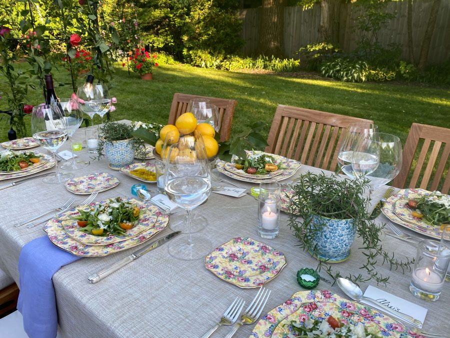 On another one of my daily walks, I stopped into our local home consignment store and saw some vintage dinnerware that called to me. Never one for vintage, at least not until now, I just couldn’t not take the plunge. Hey, it was service for 21! With soup bowls, luncheon plates, covered vegetable dishes, two coffee pots, the works! I asked the shopkeeper if I could take a photo to consult with Caroline about mood vibe (what we say when we are setting the tone of a gathering, and this was Italian Tuscan countryside), and consult we did. She thought they were great, I called back and said, ‘I’ll take the set’. Now I’m the proud new owner of a previously owned 142 piece set of Royal Winton Summertime Chintz Welbeck Dinner Set, yippee, lots of pretty parties to plan down the road.