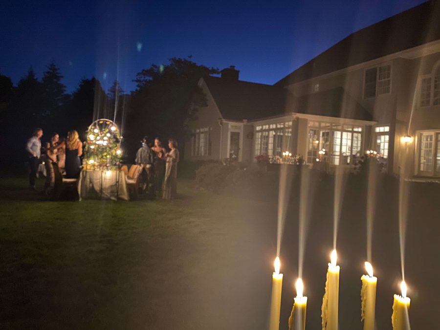 So for the long table we had glowy inexpensive tablecloths, vintage china, lavender linen napkins, polished silver, tons of Reidel Performance wine glasses, and bowls of fresh lemons instead of fresh flowers. We bought bags of lemons at the grocery store, lemon leaves at the florist, and Alexis built beautiful full centerpieces. I had ordered large ornate candelabras for the table as well; they just didn’t fit. We really wanted to use them for the party, so after thinking for a bit I decided to bring them out at nightfall, creating a kind of ‘after-party’ mood, they were so great, even with light green wax dripping all over.