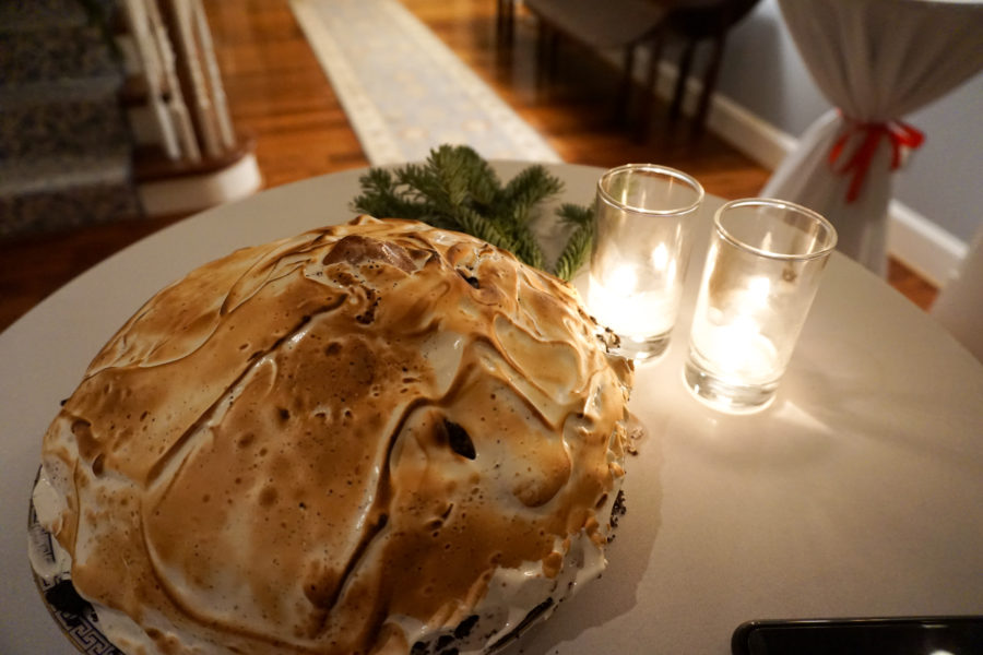 For the food I put together a simple cheese tray garnished with figs and local Amish honey. Shrimp cocktail and gifted salted cashews from the new son-in-law’s parents, all served in the living room with kids on the floor and piled all around, it was divine. We did buffet style for dinner, a platter of those legs, asparagus risotto with truffle oil, sliced beef tenderloin with horseradish cream sauce and garnished with small roasted tomatoes still on the vine. Desert was Baked Alaska; it really didn’t freeze fully and kind of fell on the plate, yet it was delicious all the same.