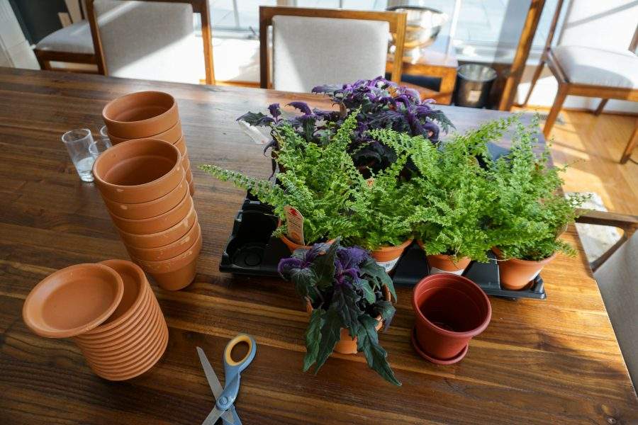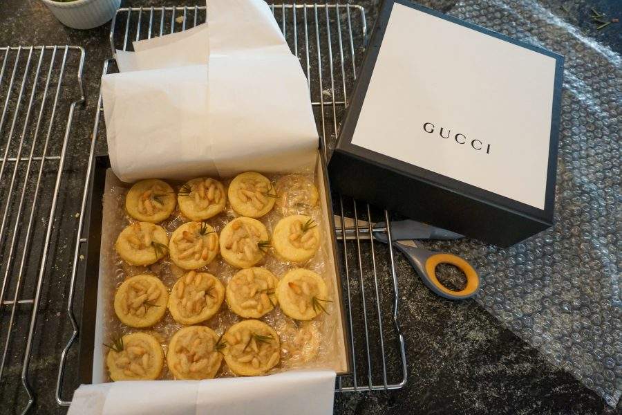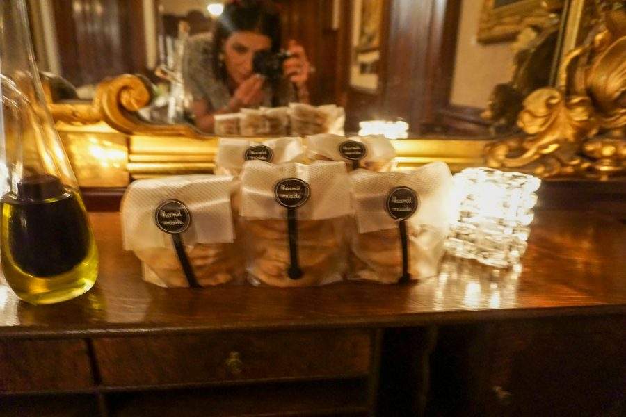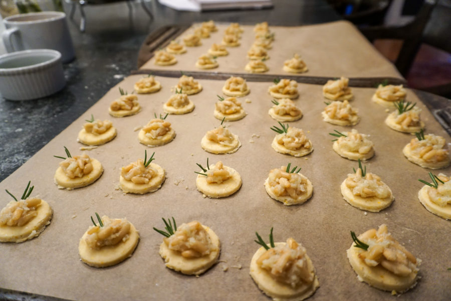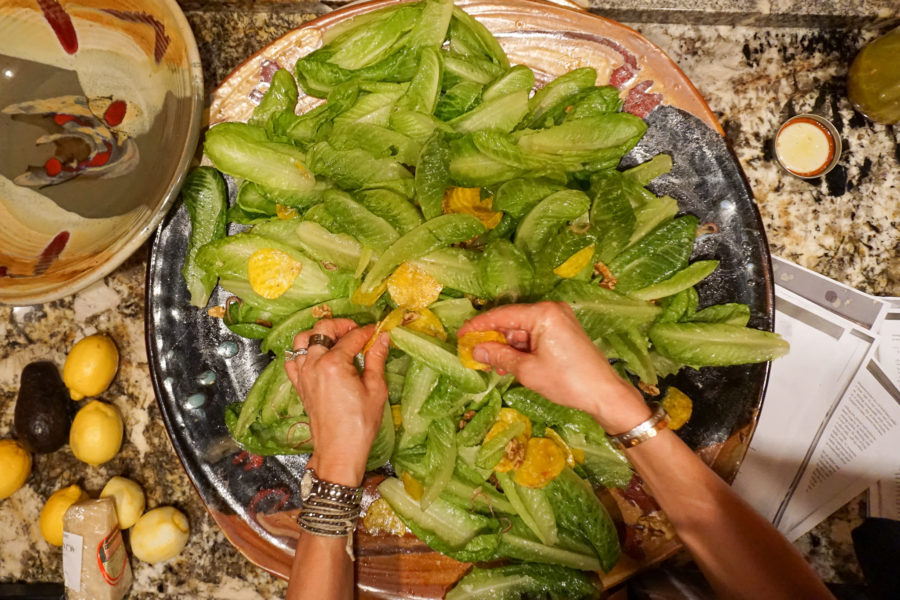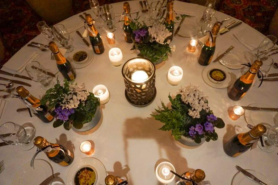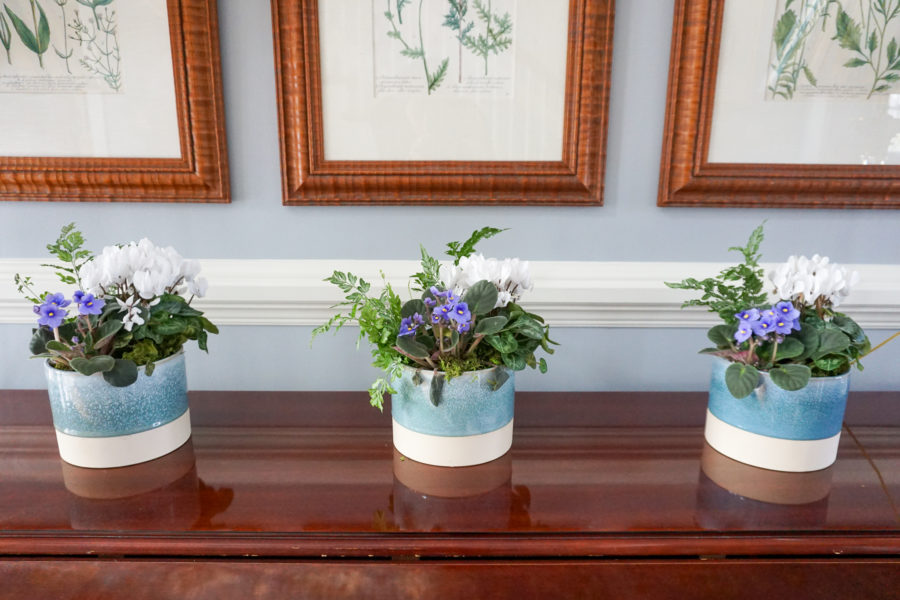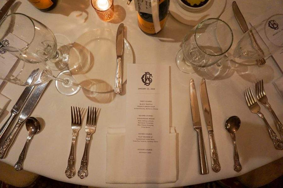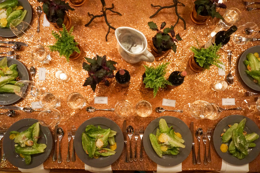 For special dinners out I always like to add a personalized touch, and I usually like to send guests home with a small little gift or two. Candles and flowers are also two things I almost always bring to add light and texture to the table. For this celebration I baked a double batch of chocolate chip cookies and wrapped them up in cellophane bags. I wish I had a great relationship with a florist, I guess that can be a 2020 project, as I’m always buying flowers at the grocery because it’s just easy. None of the cut flowers looked great that day so instead I bought three potted things, I was drawn in by the freshness of the blue, white, and green tones. A table for eleven is a big round, therefore the three pots to make more of an impact, one might have gotten lost.