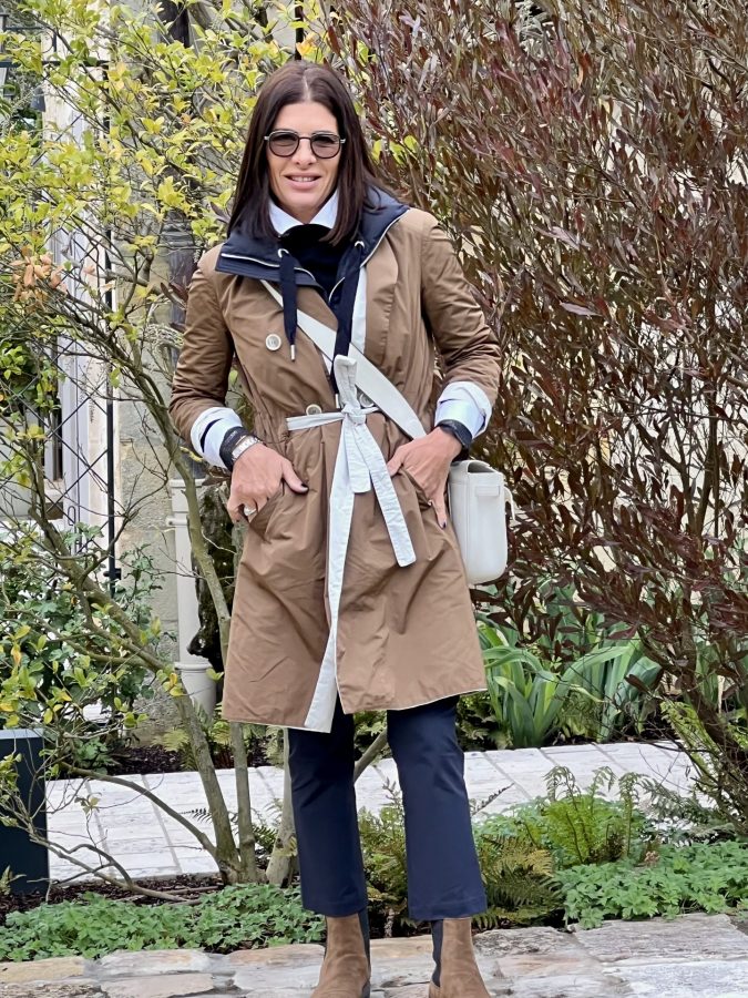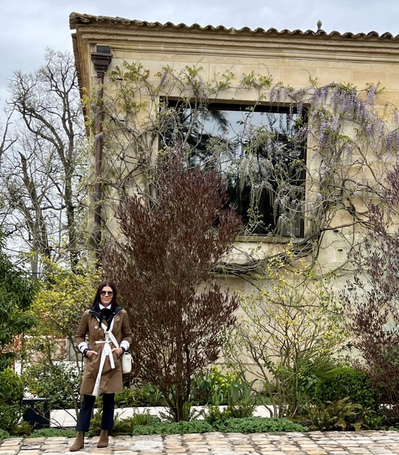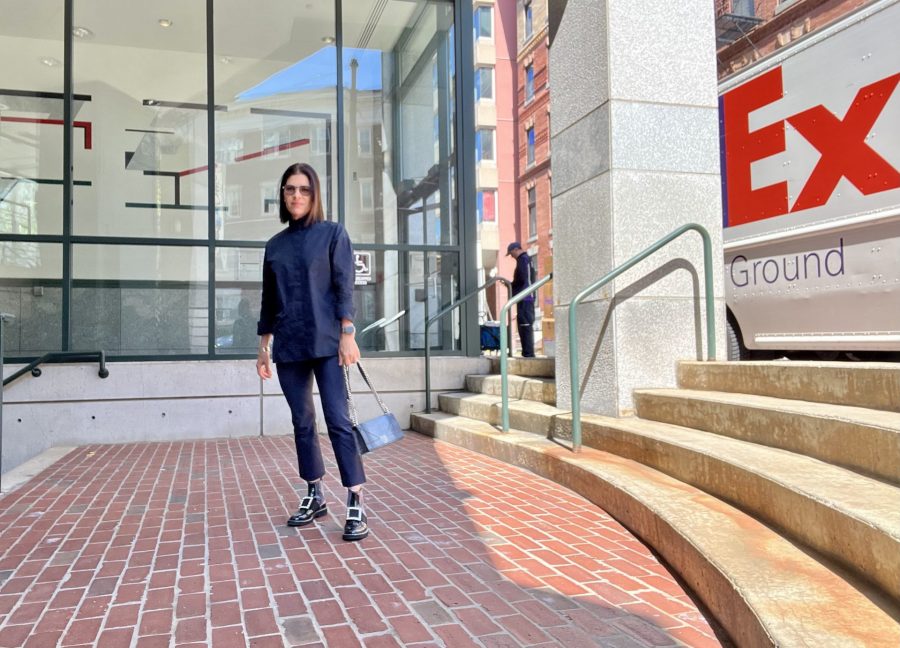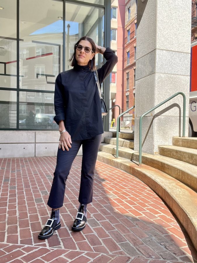 I wore these pants while wine touring in Bordeaux, France, and then again in Cambridge, MA. The French look included a white blouse under a black cashmere turtleneck (I popped both the collar and the cuffs of the blouse), brown suede Chelsea boots, and a brown and white reversible trench. I opted for a more monochromatic look in Cambridge with an ink cotton blouse and Roger Vivier Chelsea boots with a Crystal Buckle.