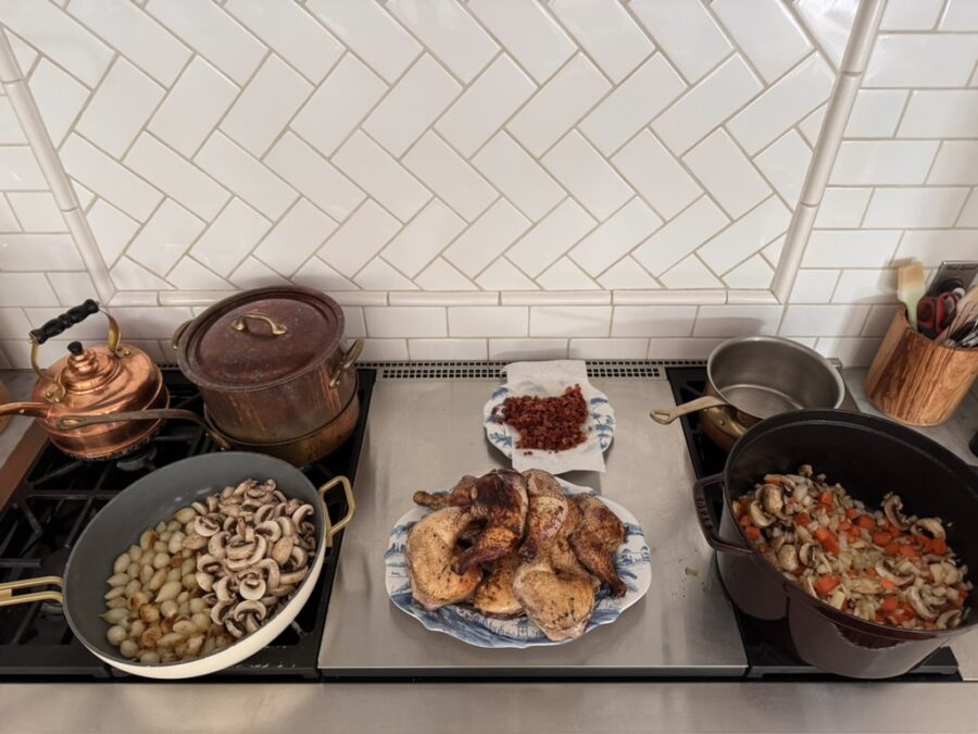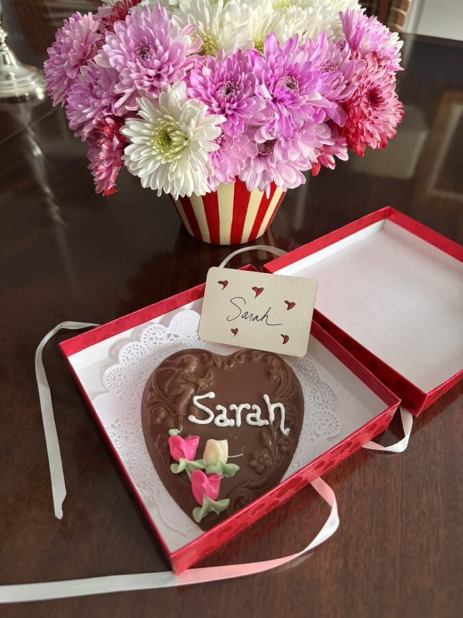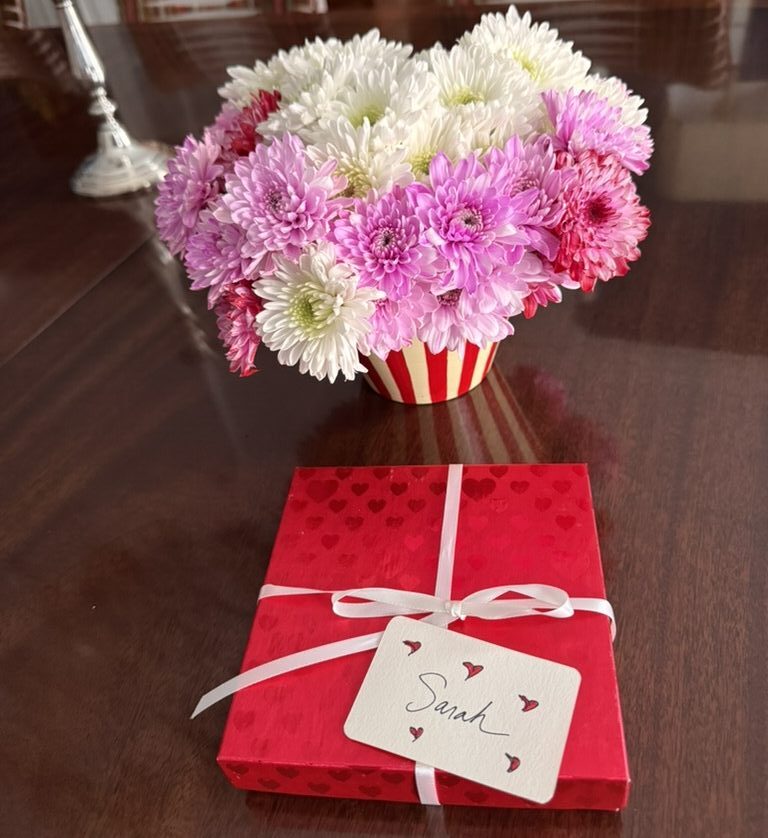 So home it was. Coq au vin and old-fashioned chocolate mayonnaise cake were on the menu. I bought chocolate hearts at the local candy store and had them ‘monogrammed’. Used carnations instead of roses. Warm and cozy. No hard-to-get reservations needed. No feeling like we needed to hurry along so the restaurant table could be turned. Sure, it was probably a full-tilt effort, can’t really remember the work of it all now. We were together, and that was the magic.