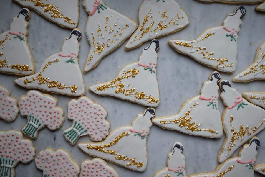 The bride cookie for Caroline’s wedding showers was one of my favorites. To get clean edges I always chill the cutout shaped dough on the cookie sheets before baking. When frosting I always outline the cookie with royal icing piped from a pastry bag with a #2 tip. I then flood the entire surface, usually with simple white frosting, let it harden a bit and then decorate simply or with abandon.