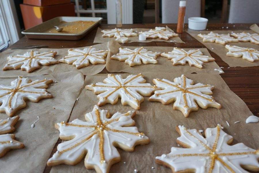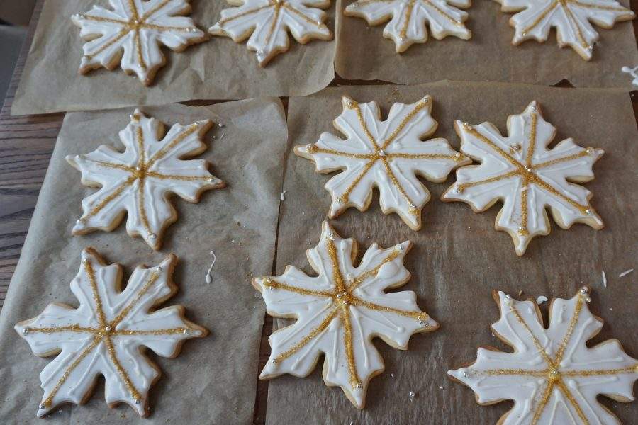 The large snowflakes I made just this week are simply one-color frosting, white, and embellished with colored sanding sugar.
