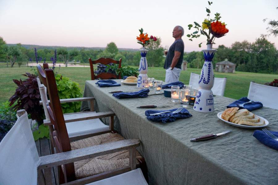 This evening I’m doing a Harvest Dinner in our barn, doors and windows wide open and small space heaters brought on board from the ski house. Soon I’ll roll out the dough for the French Apple Tart, start to proof the yeast for the bread, brown the chicken pieces for the Coq au Vin, and reheat and finesse the Butternut Squash Soup with Bacon and Crème Fraiche I started last night.