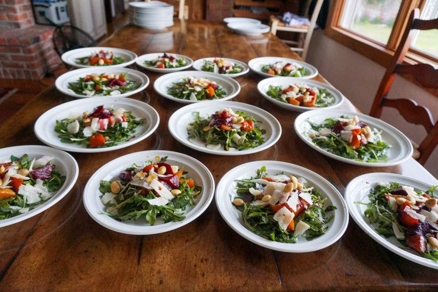 I like to plate things up on the dining room table before serving, here you see salads that I unfortunately over-dressed a little