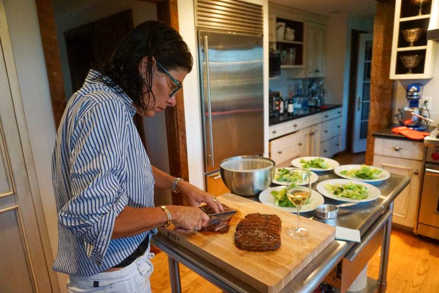 wet hair, husbands shirt, slicing some flank steaks