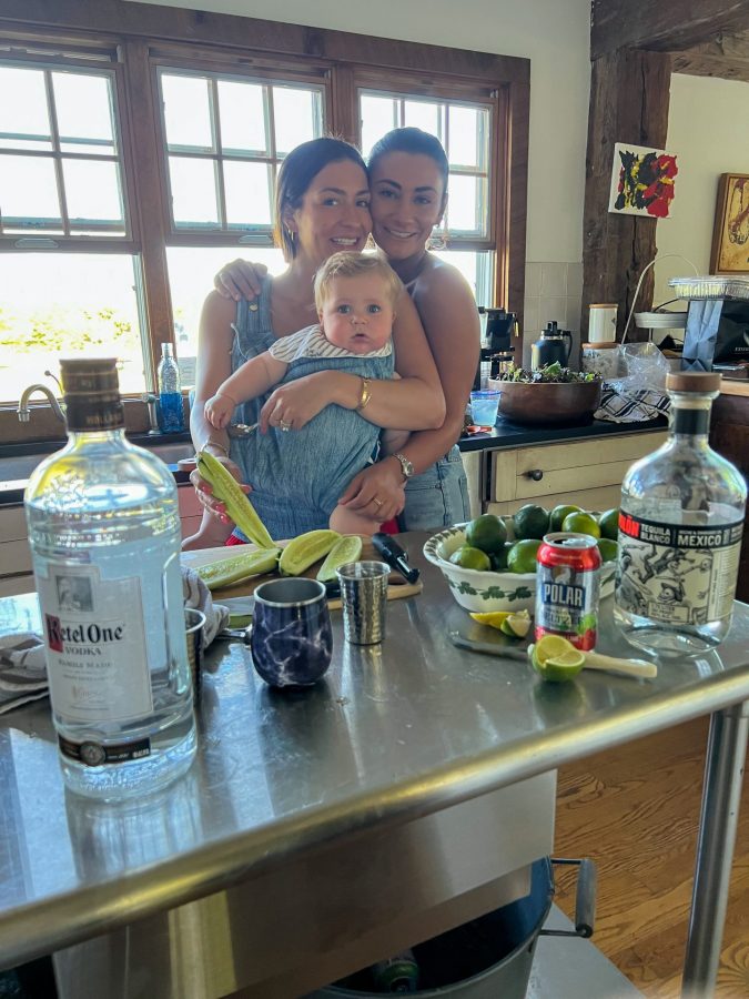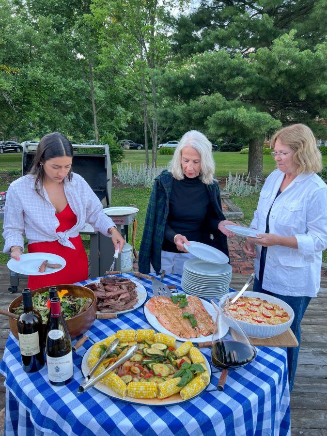 Caroline, Sarah, and Williams prepped vegetables and made drinks.