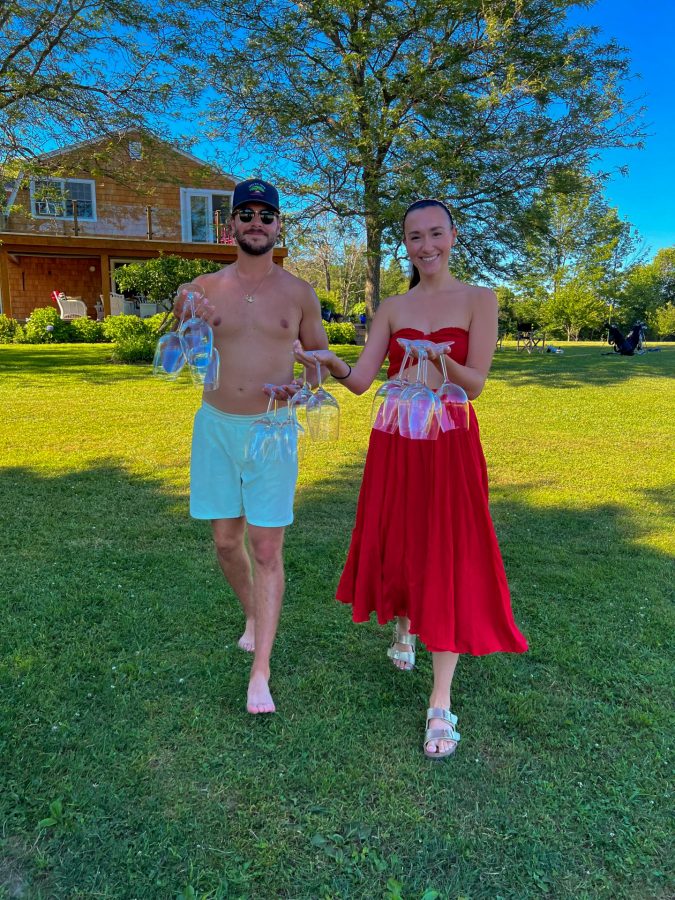 Across the yard with all the glassware.