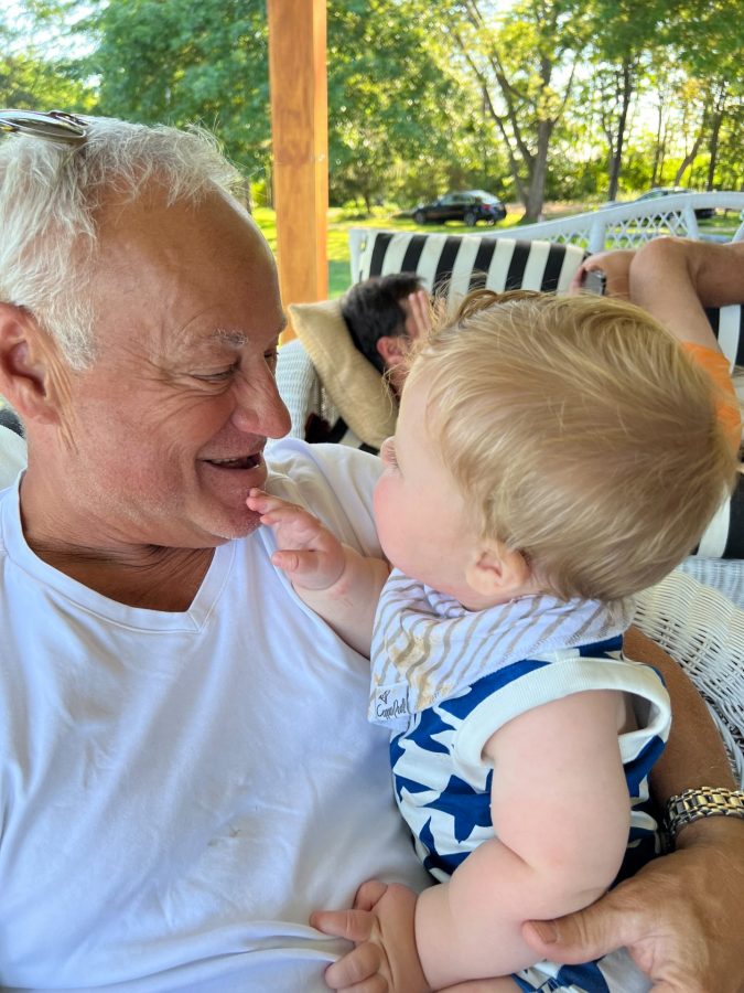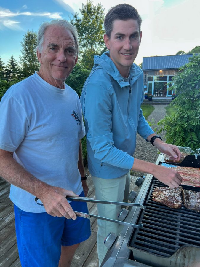 Father and son on the grill with the prepped protein.