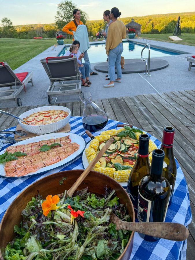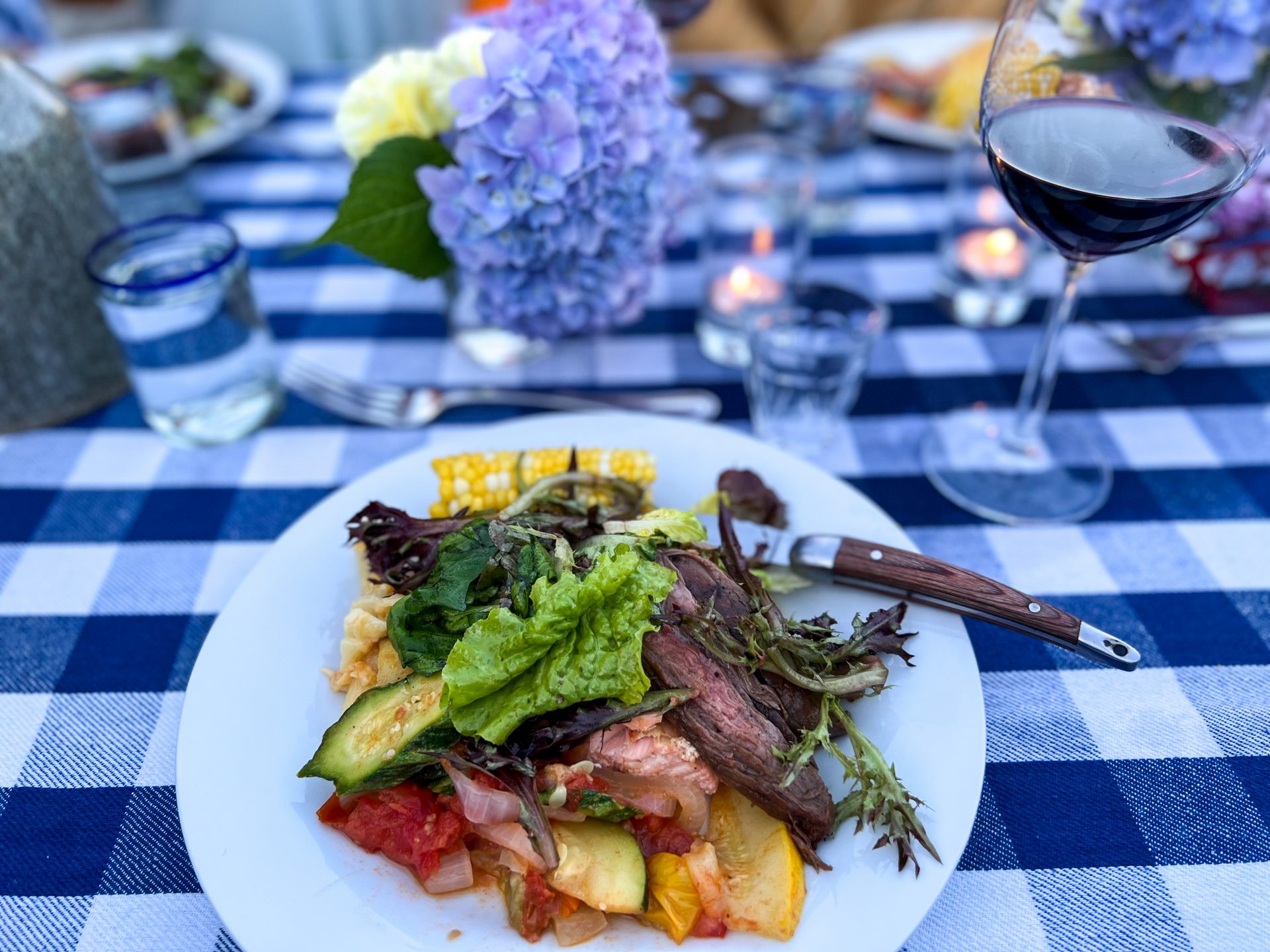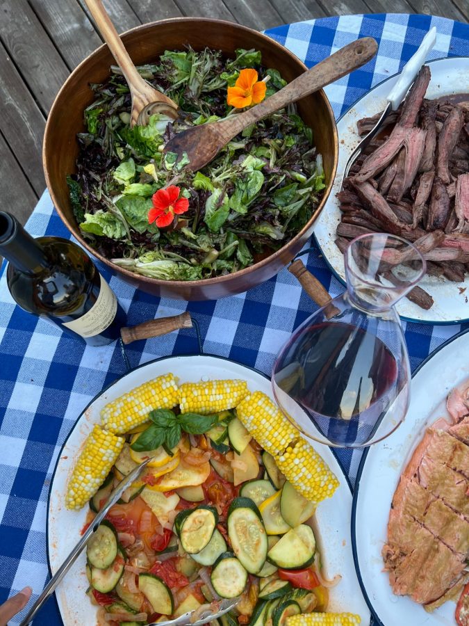 I think there’s nothing better than dining al fresco during the summer months surrounded by those you love. Last weekend we tucked into some delicious marinated grilled flank steak, grilled salmon, traditional mac & cheese, sauteed seasonal vegetables, and a simple salad of homegrown lettuces. You can visit Simply Recipes for my go-to super-easy flank steak recipe. It never fails. Sometimes I leave a steak or two stewing in this marinade for a few days, and it just gets better.