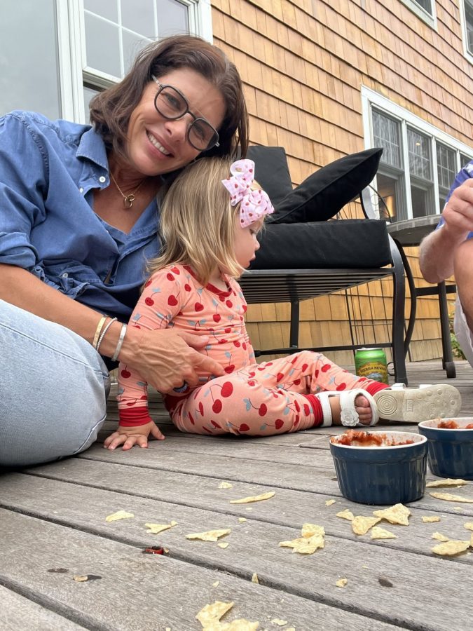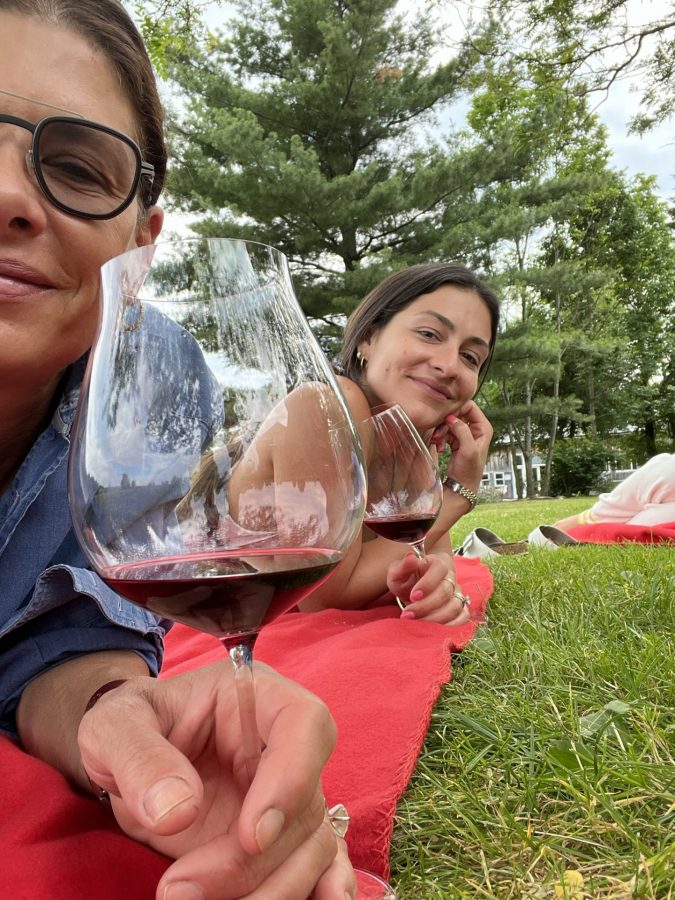 Caroline and I have a wine party on the lawn by the sandbox. Nevermind my no-manicure look, it’s been busy.