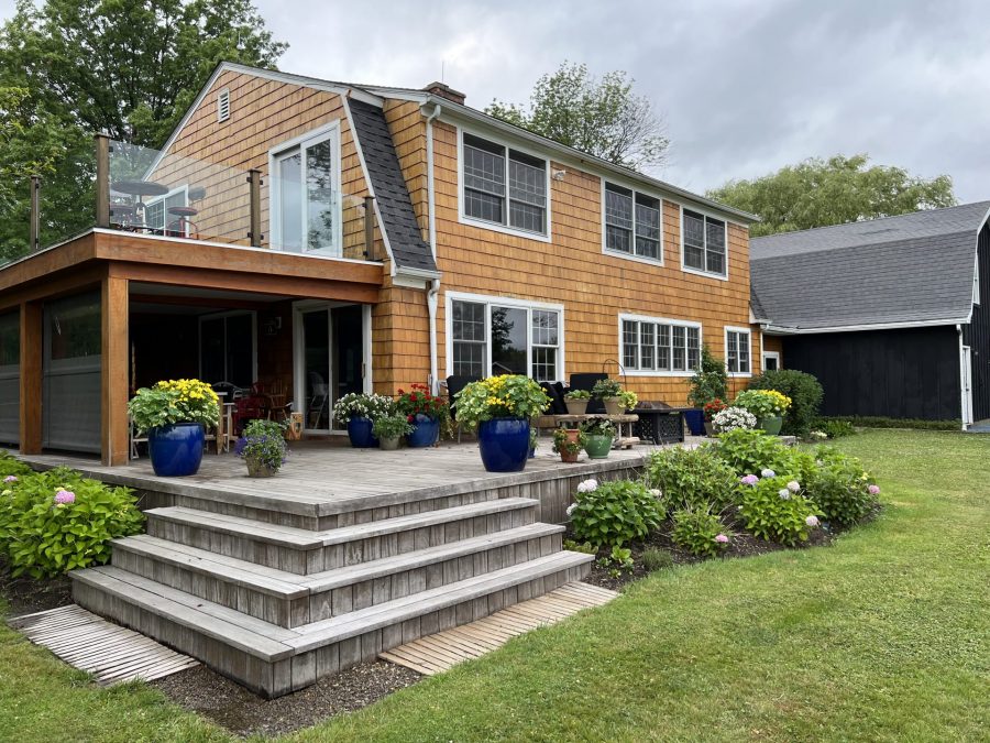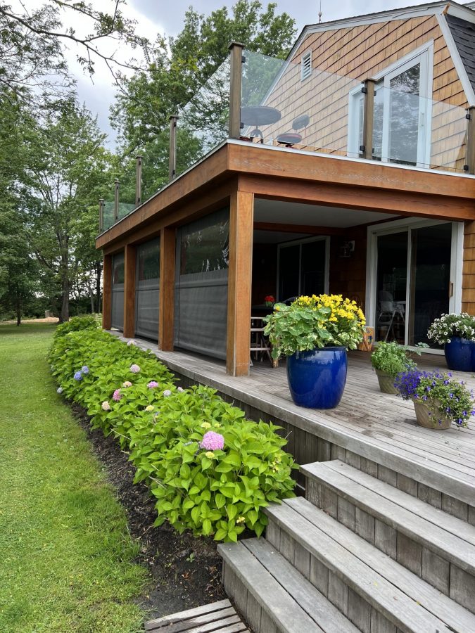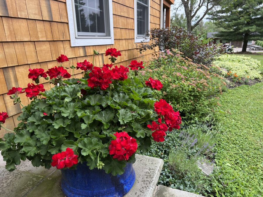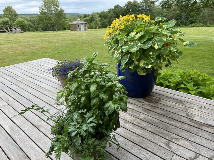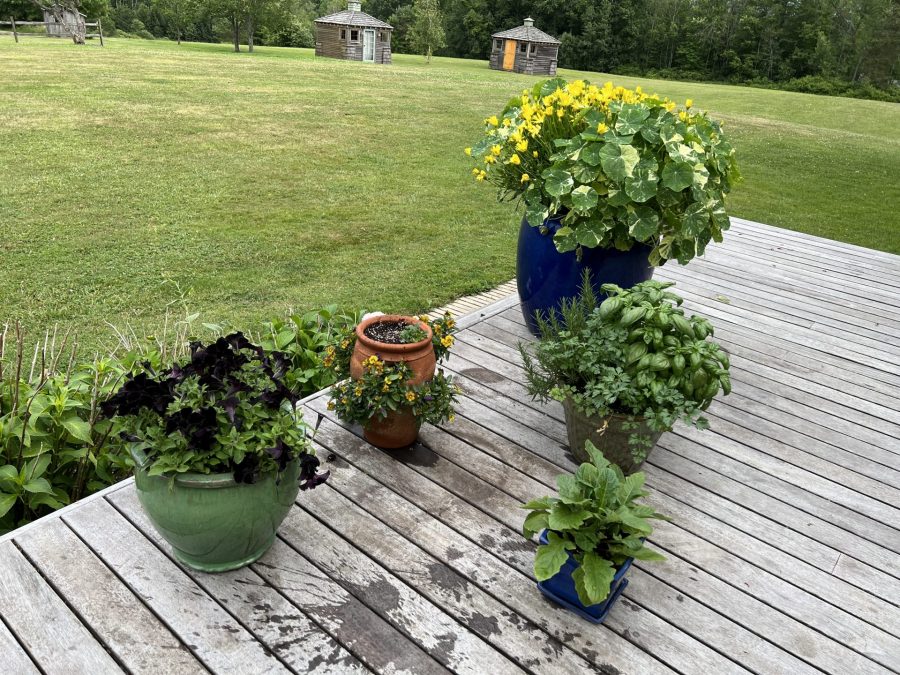 Some of my pots on the deck. I move them around at will. The tiny houses in the background are for overflow guests. Caroline and William actually snuck out there one morning at 5 am so as not to wake the entire full house.