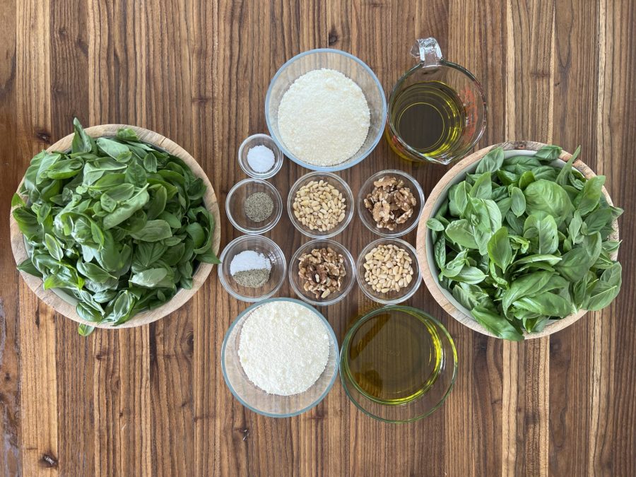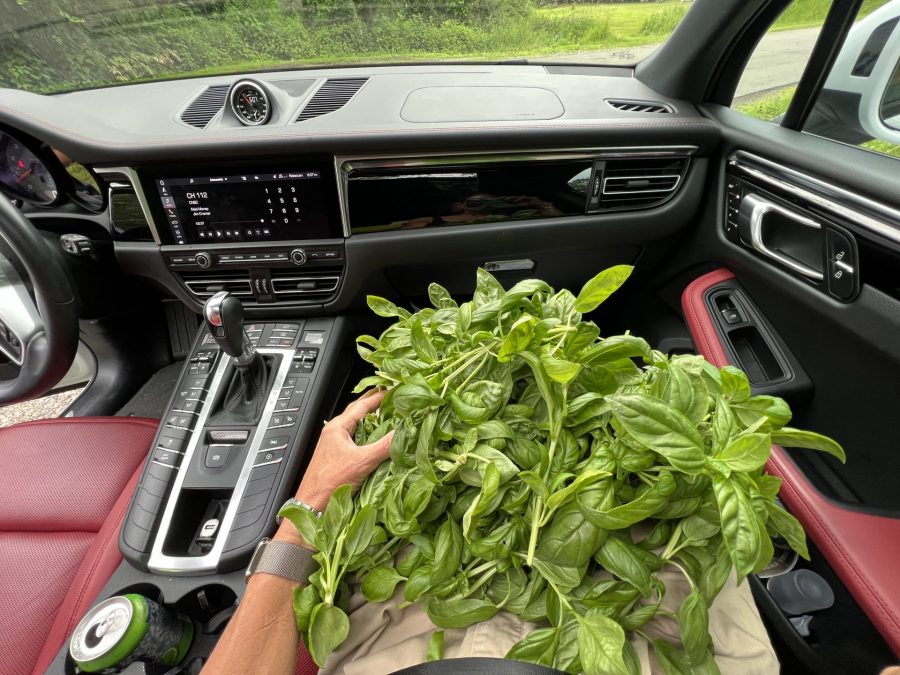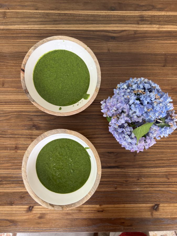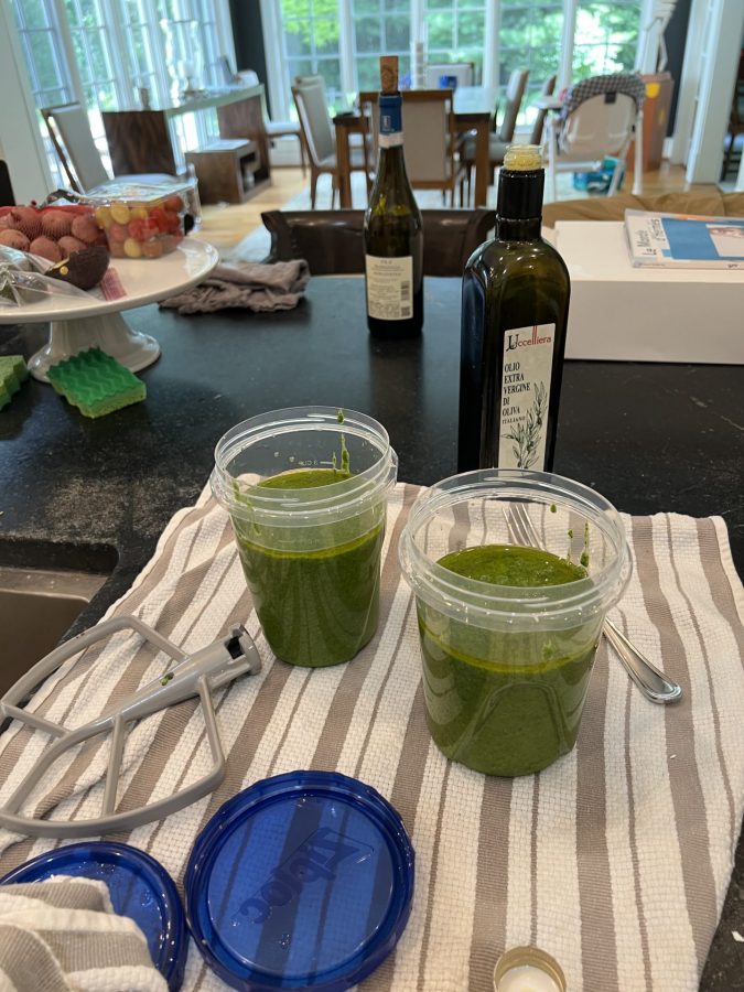 Minutes before I left the countryside, I cut the basil back. While Bill was driving us home to our life in the city, I plucked each leaf off the stems. I was determined to make pesto and to put it up in the freezer for another time. I finished just before I left for the airport, and Caroline laughed at me lovingly and said, ‘only you, Mom, would make pesto before flying.’ Like most things I do, I made double pesto.