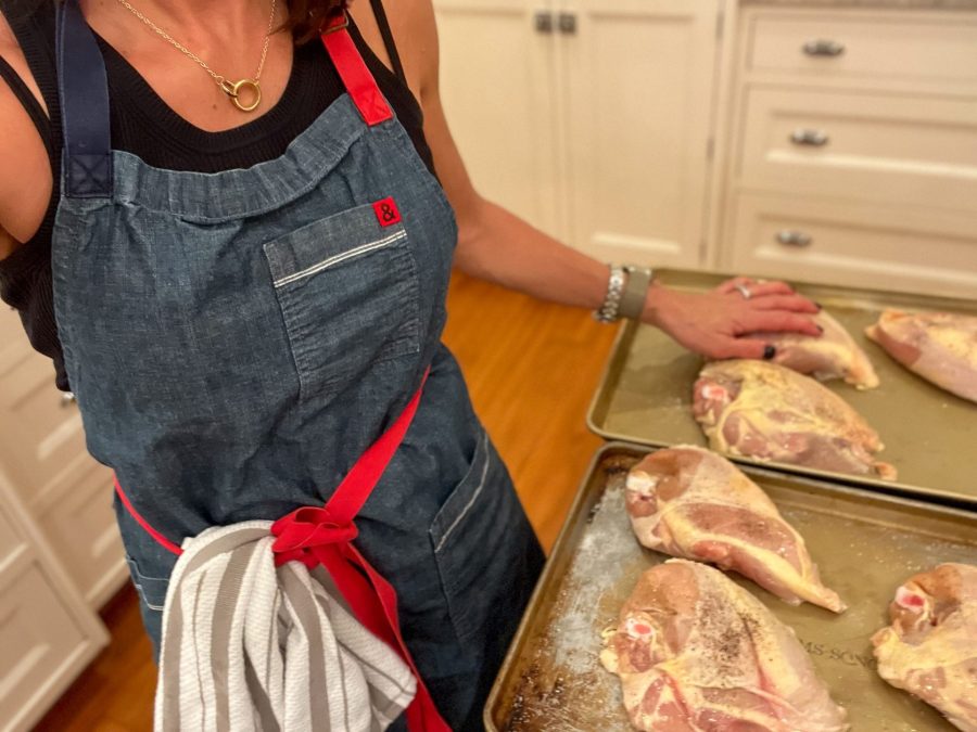 usually in an apron with a kitchen towel at the hip, getting going with the pot pies