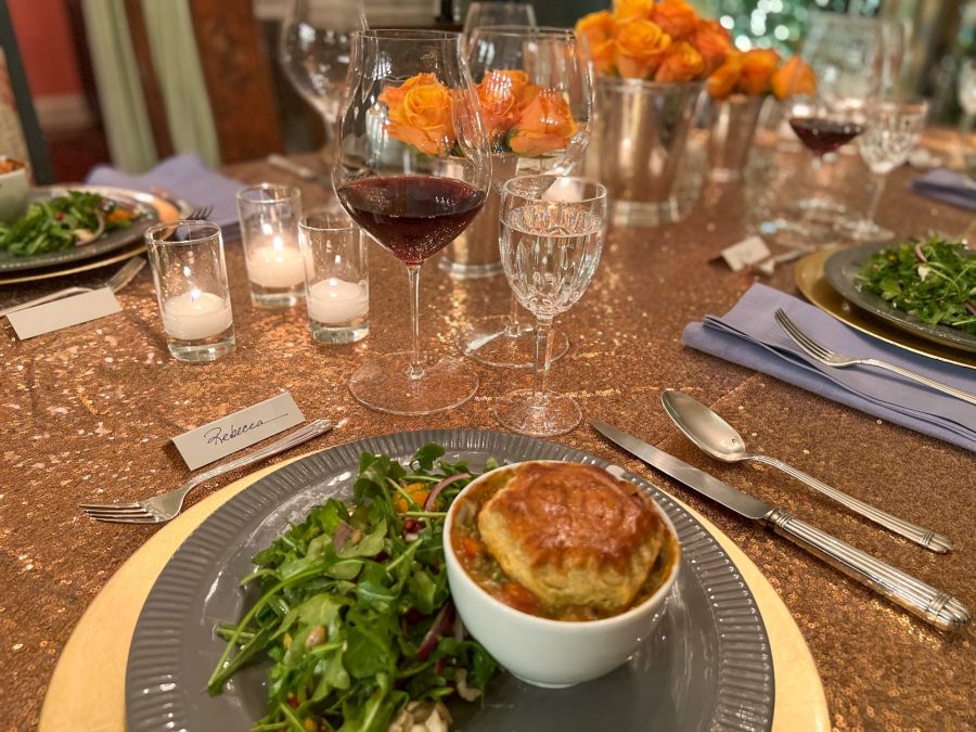 I scooped one-cup servings of pot pie mixture into oven-safe white coffee cups and topped each of them with a Pepperidge Farm Puff Pastry Shell, as the Puff Pastry Sheets called for in the recipe were all sold out. The result was entirely satisfactory. With the salad alongside, it was a lovely dinner.