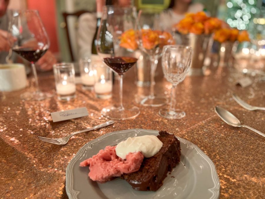 we brought out the sequin tablecloth and the wine from Bill’s cellar was exceptional. store bought raspberry sorbet and house made whipped cream garnished the cake