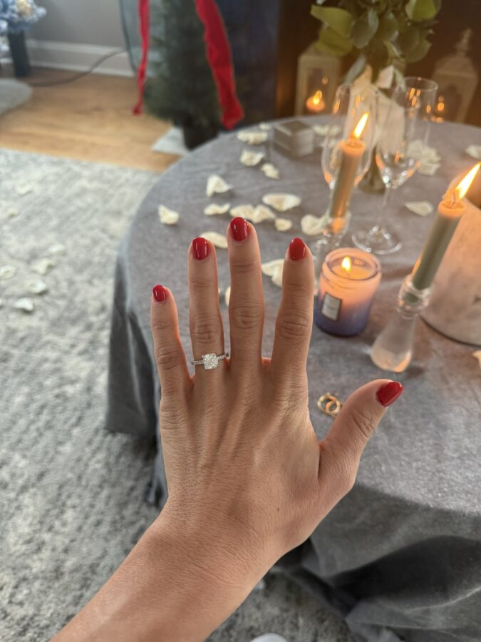 Ultimately, it was Staud that won the dress deal. My girls and I have been Staud fans for years now, mixing their bags and dresses into our rotations as the look is both timeless and novel. Initially we were drawn to dresses with embellishments and tulle, that was a quick ride. We wanted her and her ring to shine, not necessarily her dress. Staud has a Bridal Edit, and that’s where I found the dress. I chose the Charlotte Dress in Ecru. Featuring a scoop neck with corset seams through the waistline and flowing to a midi-length a-line skirt, I felt the cut and color would flatter her and stand the test of time when looking back at photographs down the road.