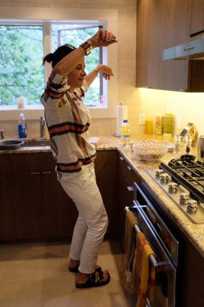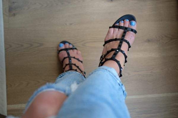 Black strappy sandals, light blue pedicures, baking a box birthday cake, feeling a good song.