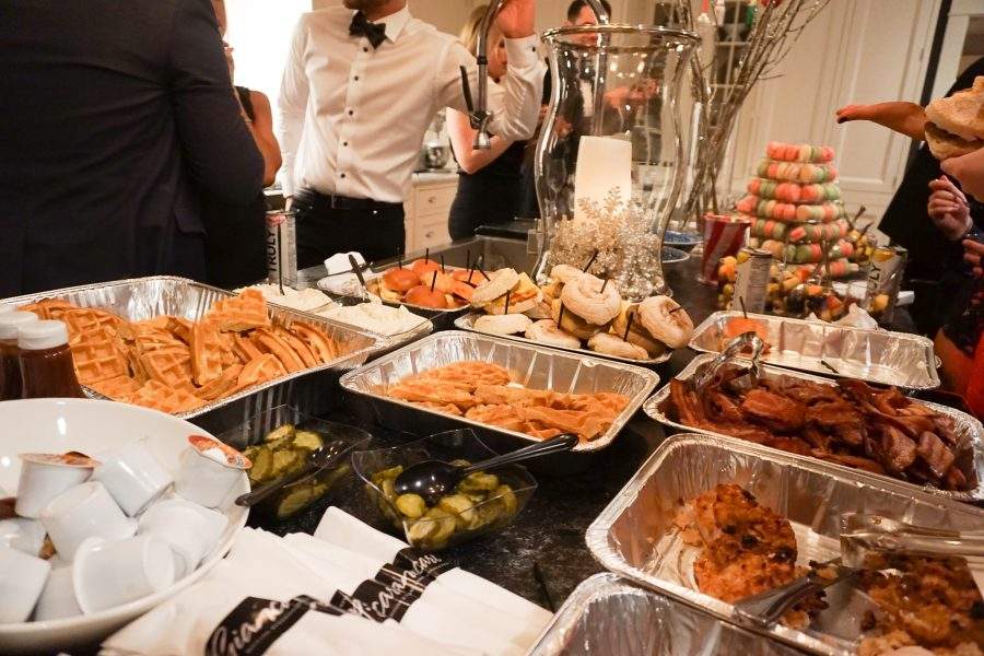 - Food: we did five passed hors d’oeuvres and two stations, raw bar and antipasti. Late night food included breakfast sandwiches, platters of bacon, chicken and waffles, fruit cocktail. Birthday cake went totally untouched, just for show, I guess.