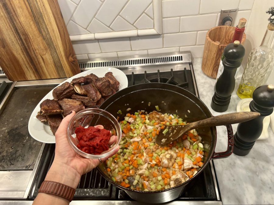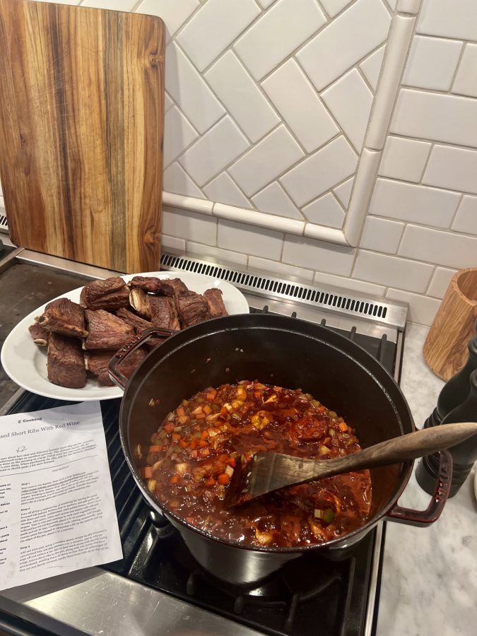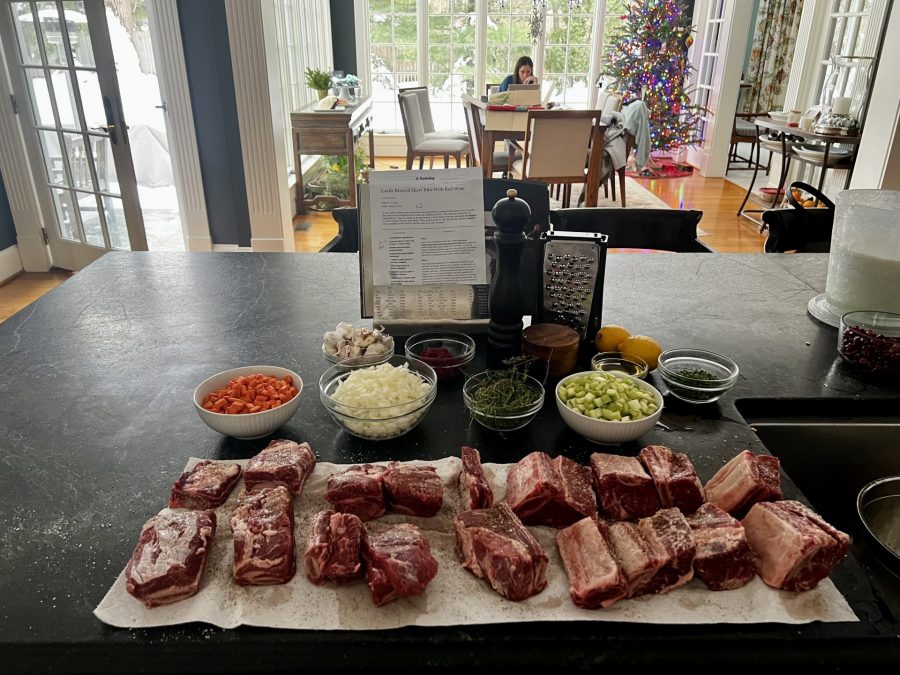 Mise en place for beef short ribs. I had walked to the market thebefore to buy supplies for two dinners, spaghetti and meatballs, and beef short ribs, and carried supplies home in a backpack and two totes. With the driving ban still in place, we all had to wait in line whilethe store let in 50 shoppers at a time. I was in search of comfort food.
