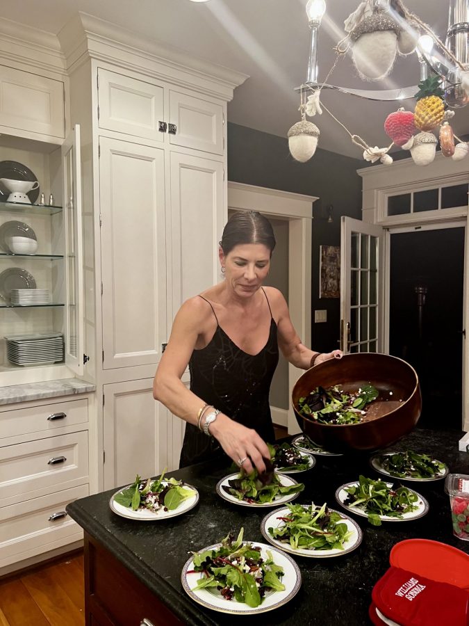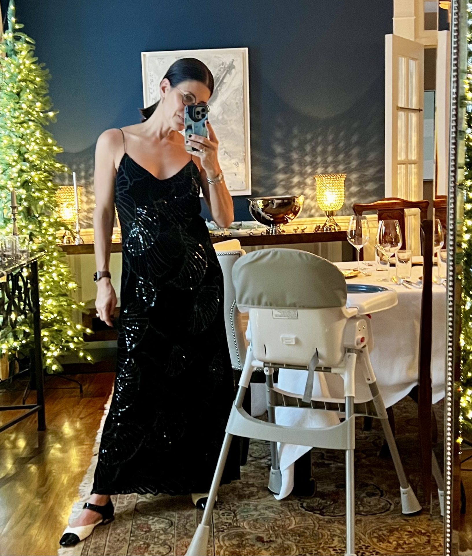 After cooking, I ran upstairs and put this dress on with flat shoes. I bought the dress last year for the holidays. It’s an easy, beautiful, comfortable look.