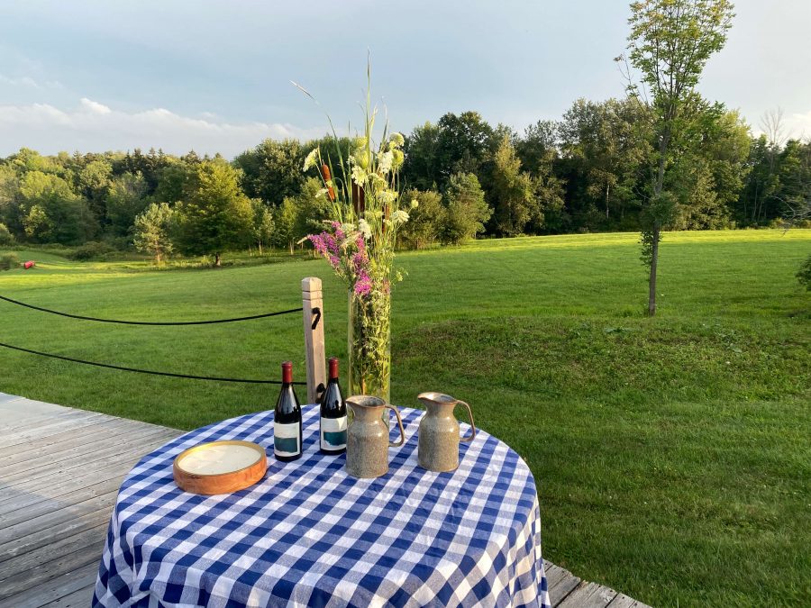 very simple self serve bar with wildflowers, tap water in jugs, and Pinot Noir