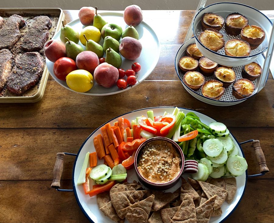 steaks ready for the grill, pears from husbands fruit orchard, corn bread muffins, and roasted red pepper hummus