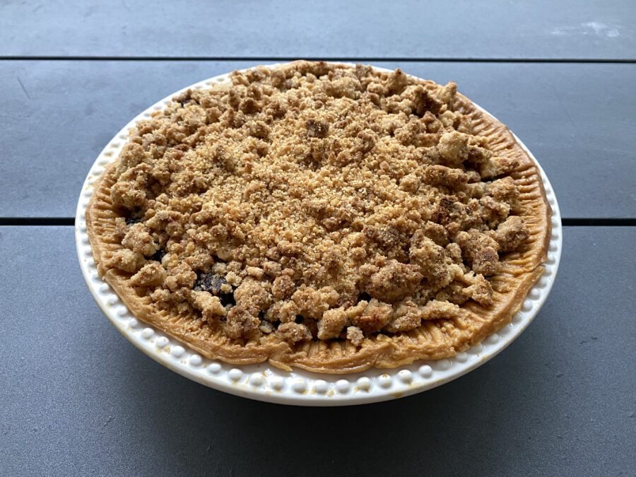 I’ve found that the best pie plate is from Bennington Potters. I actually use the round baker as I like the deep dish, and the high rim, and how it can go straight to the table looking good.