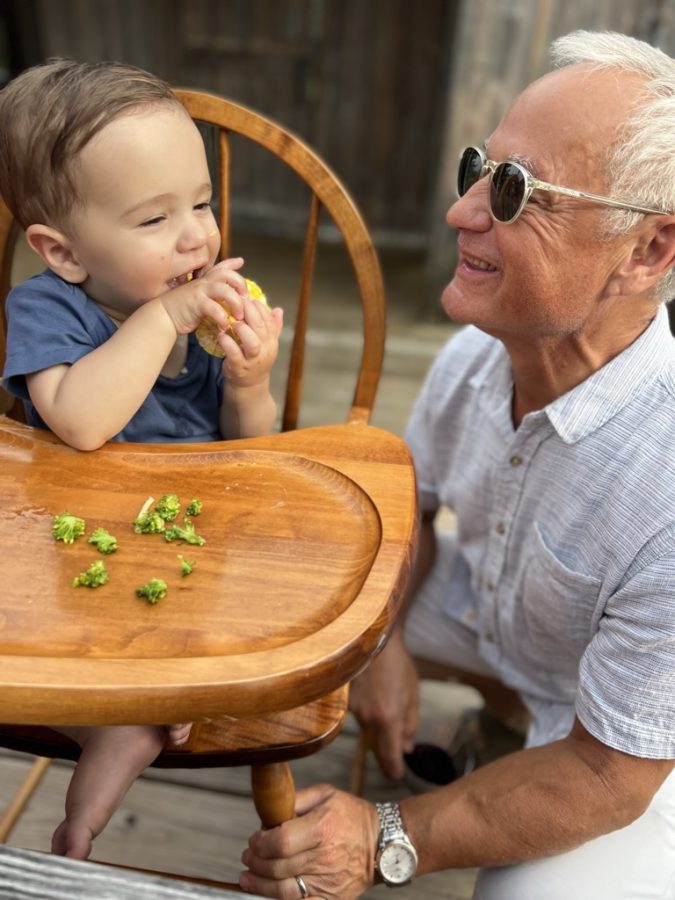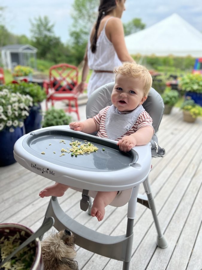 William enjoying orzo and peas. Check out Lucy waiting for the spills!
