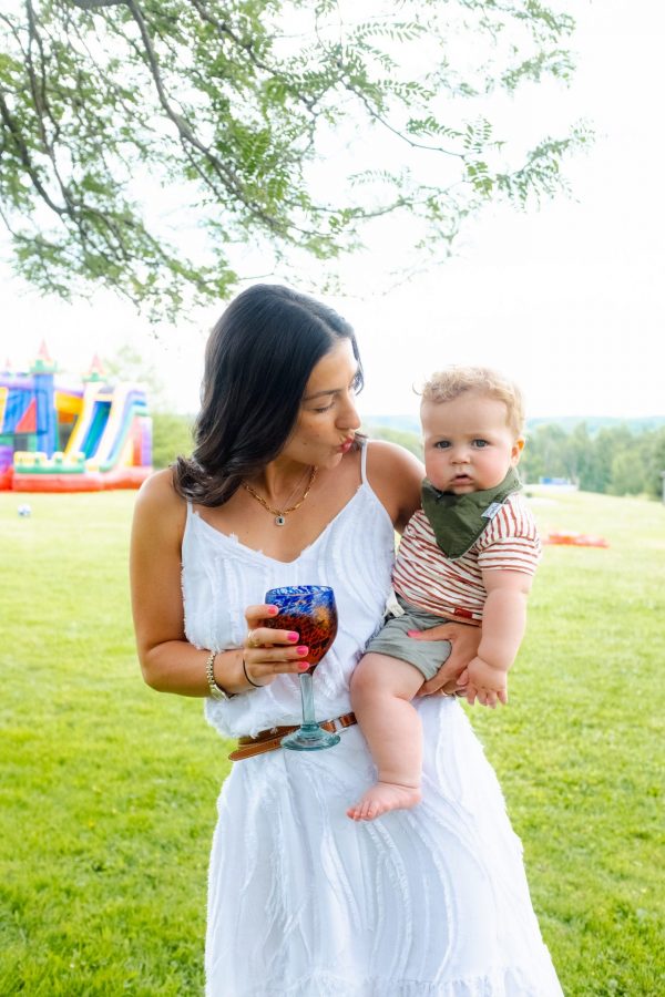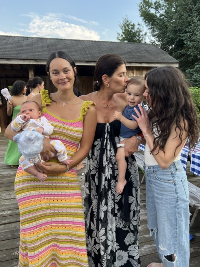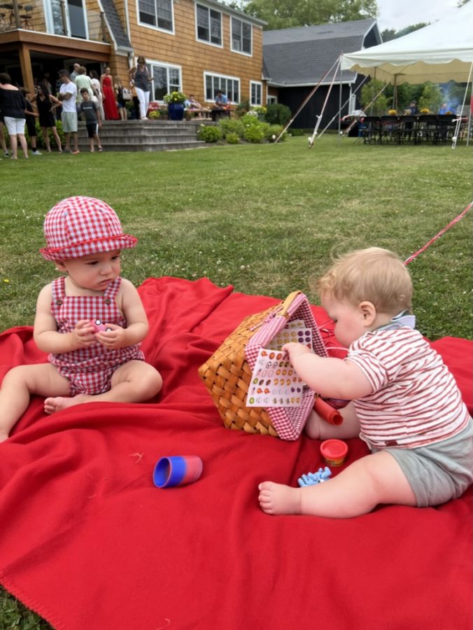 Caroline and Liam. Caroline is wearing the dress and belt that I wore ldaughter’sor Rory’s baby shower. I love that all my clothes have a second lShe’snd can be re-worn by myself, my daughter, and my friends.