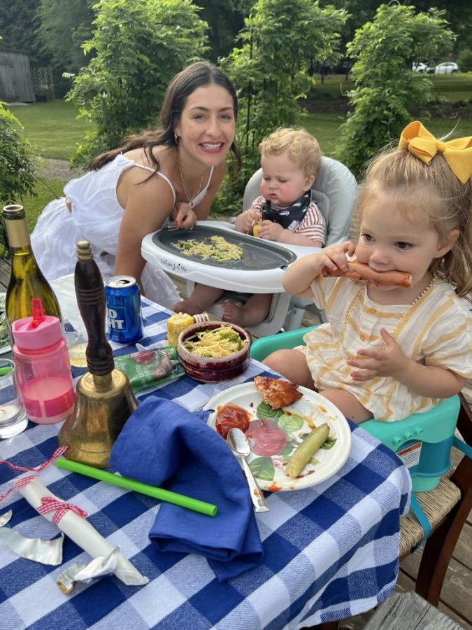 I love how Peyton is tucking into her hot dog. Notice the large brass dinner bell, it gets plenty of action around here.