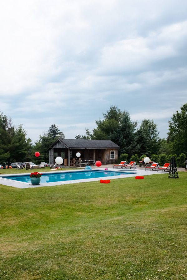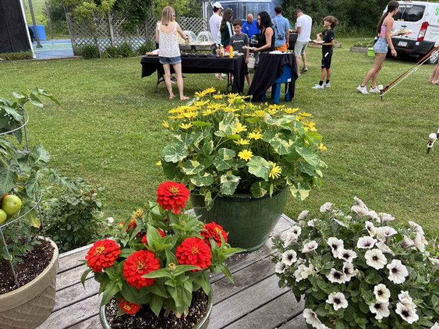 The pool area was set with lawn games and decorated with balloons. After many seasons of doing mixeRory’stings in the large pots I have settled on a single color bright red geranium as they tolerate full sun and infrequent watering.