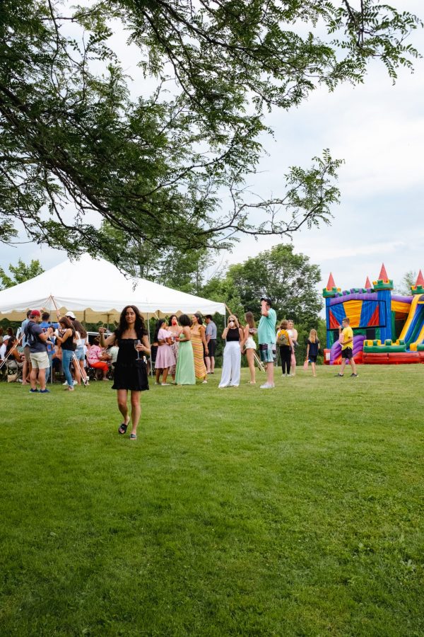 Hot dogs, hamburgers, sausages, and salads were served from a grill and food truck behind the tent
