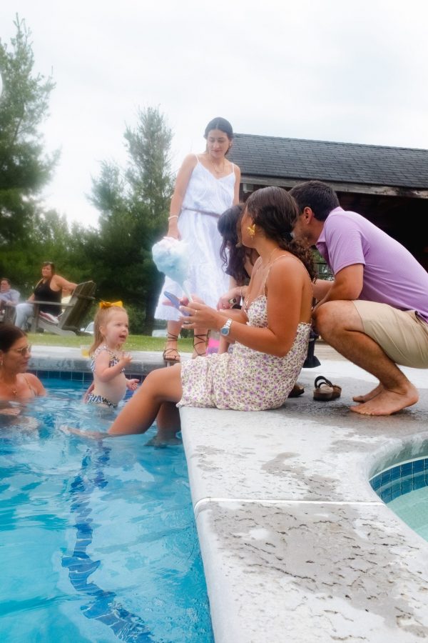 Elizabeth, Karen, Rory, and Maisy are on the deck, the cocktail and pool area in the background.