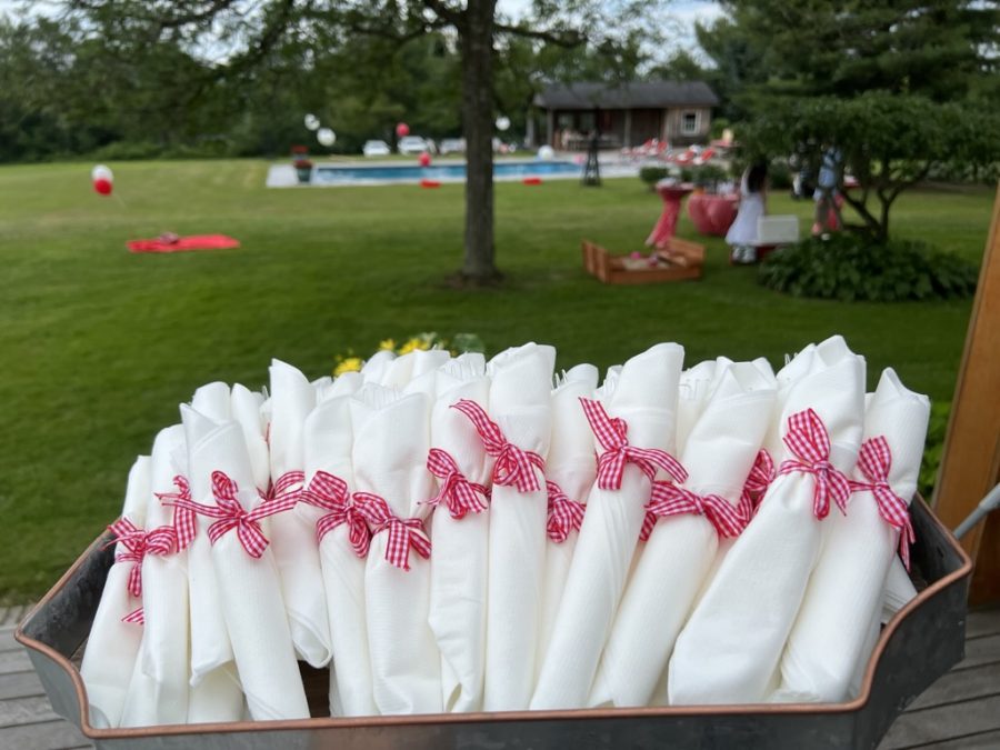 Lindsey tied the flatware and paper napkins with red gingham ribbon