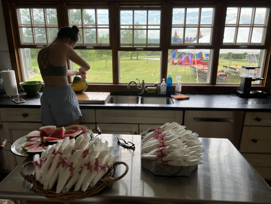 Lindsey in the kitchen slicing the watermelon. It was all hands on deck getting ready. Most of our at home parties are DIY, and we all pitched in.
