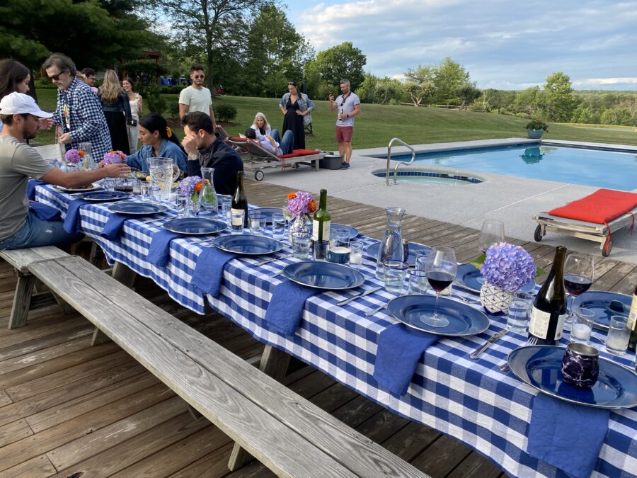 blue gingham tablecloths I bought from Amazon, new blue linen napkins from Williams Sonoma (48 of them! machine wash and cold, hang to dry, saving these for good for awhile) and used for Lindsey and Ethan’s baby shower BBQ, sister-in-law borrowed them for my goddaughter Erin’s engagement brunch, love and live to share things.