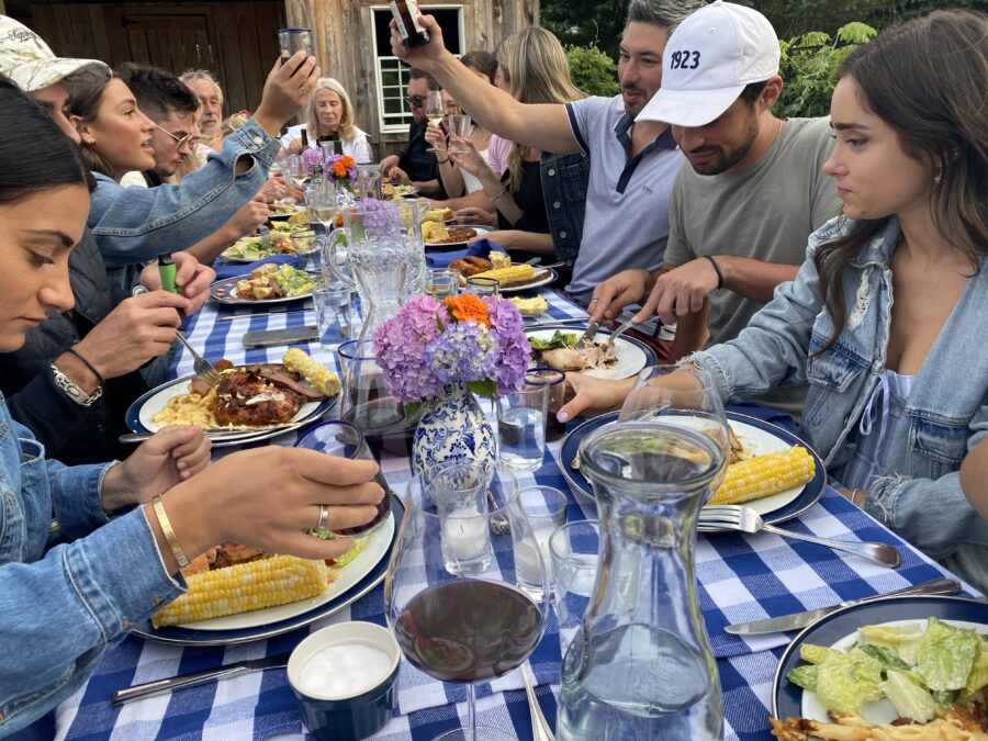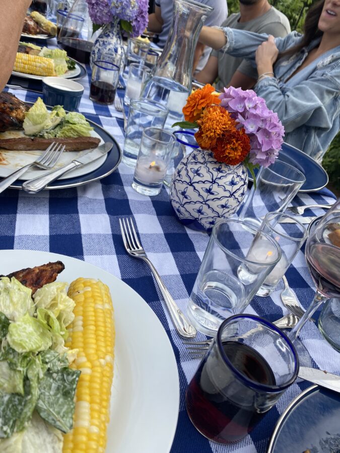 served one of the first crops of local corn, .69 cents an ear, homegrown Romaine with scratch Caesar dressing, and the chicken and beef from local purveyors. Booie and Lexi cut the flowers from the garden, using the blue and white vases from Caroline and Sean’s rehearsal dinner three summers ago…